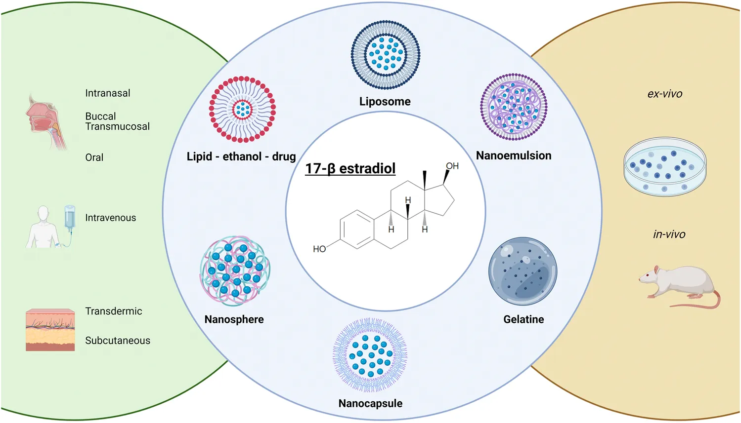 The hormone 17β-estradiol (E2), an endogenous variant of estradiol, is emerging as a promising therapeutic agent for various inflammatory conditions, and it can be administered as a monotherapy or as an adjunct to other treatments. The therapeutic utility of E2 is underscored by its potential to induce fewer adverse effects and drug interactions when compared to its synthetic counterparts. Empirical evidence, such as the investigation conducted by Zhu et al. (2022), corroborates the anti-inflammatory efficacy of E2, particularly in the treatment of diseases like hepatocellular carcinoma, where it modulates the MAPK/NF-kB signaling pathway [1]. Additionally, E2 exhibits a therapeutic role in the management of tendon degeneration by mitigating inflammation and regulating apoptotic processes in tissue [2]. Nonetheless, the lipophilic nature of E2 poses substantial challenges in developing an effective delivery system [3]. Nanotechnology-based drug delivery systems present a solution to this challenge by increasing the bioavailability of E2. These nanostructured systems offer advantages such as targeted drug delivery, controlled release, and enhanced bioavailability, attributed to their prolonged circulation time in comparison to non-encapsulated drugs [4]. The precision targeting capability of nanocarriers not only directs the drug to the specific site of disease but also safeguards the drug from premature metabolic breakdown. Furthermore, the enhanced surface area-to-volume ratio of nanocarriers allows for dosage reduction, thereby improving the safety profile of the drug. The selection of an appropriate nanocarrier, be it polymeric or lipid-based, is determined by the drug’s physicochemical properties and the intended therapeutic outcome. For instance, the U.S. Food and Drug Administration (FDA) has sanctioned the use of Estrasorb™, a nanotechnology-based E2 delivery system, for the alleviation of menopausal symptoms [5]. Clinical studies have validated the safety and efficacy of nanotechnology-amplified hormone replacement therapies, which typically combine estradiol with hormones such as progesterone, in treating menopausal symptoms and reestablishing hormonal equilibrium [6, 7].