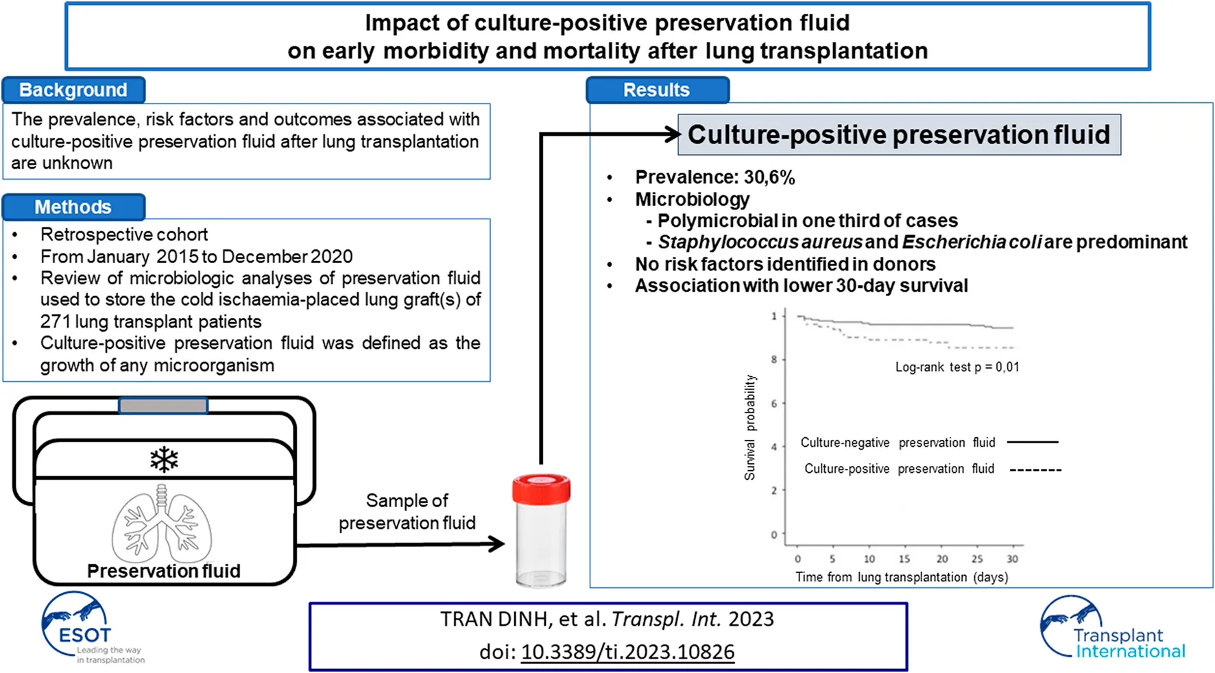 Tran-Dinh A, Tir I, Tanaka S, Atchade E, Lortat-Jacob B, Jean-Baptiste S, Zappella N, Boudinet S, Castier Y, Mal H, Mordant P, Ben Abdallah I, Bunel V, Messika J, Armand-Lefèvre L, Grall N and Montravers P (2023) Impact of Culture-Positive Preservation Fluid on Early Morbidity and Mortality After Lung Transplantation. Transpl Int 36:10826. doi: 10.3389/ti.2023.10826
