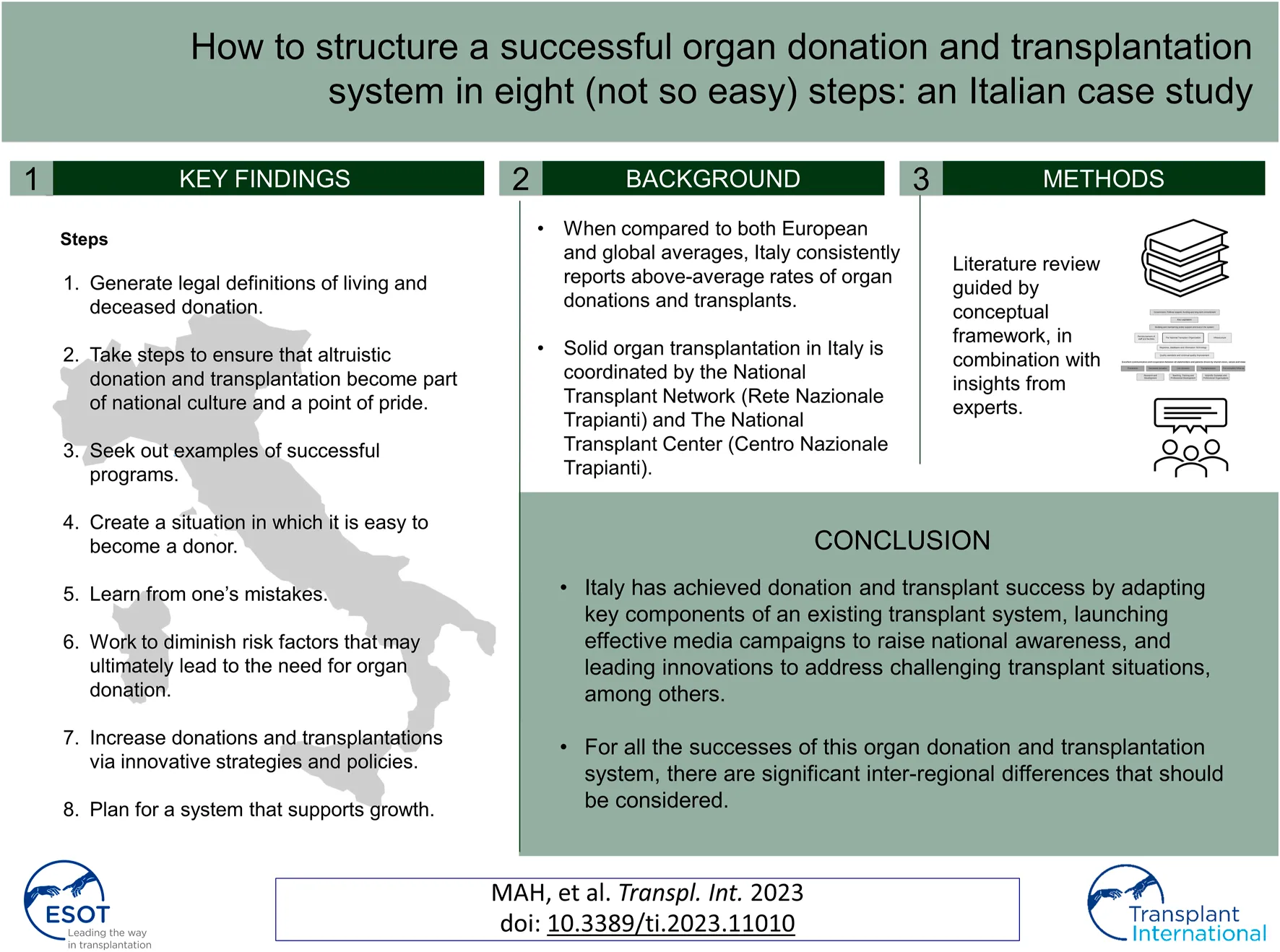Mah J, Johnston-Webber C, Prionas A, Romagnoli J, Streit S, Wharton G, Mossialos E and Papalois V (2023) How to Structure a Successful Organ Donation and Transplantation System in Eight (Not So Easy) Steps: An Italian Case Study. Transpl Int 36:11010. doi: 10.3389/ti.2023.11010