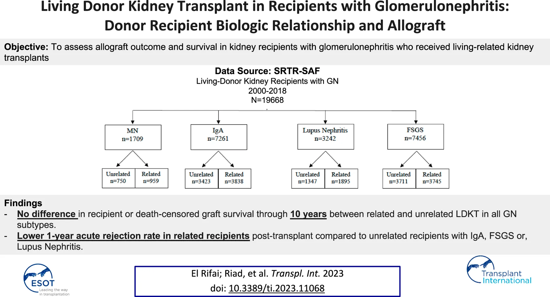 El-Rifai R, Bregman A, Klomjit N, Spong R, Jackson S, Nachman PH and Riad S (2023) Living Donor Kidney Transplant in Recipients With Glomerulonephritis: Donor Recipient Biologic Relationship and Allograft Outcomes. Transpl Int 36:11068. doi: 10.3389/ti.2023.11068