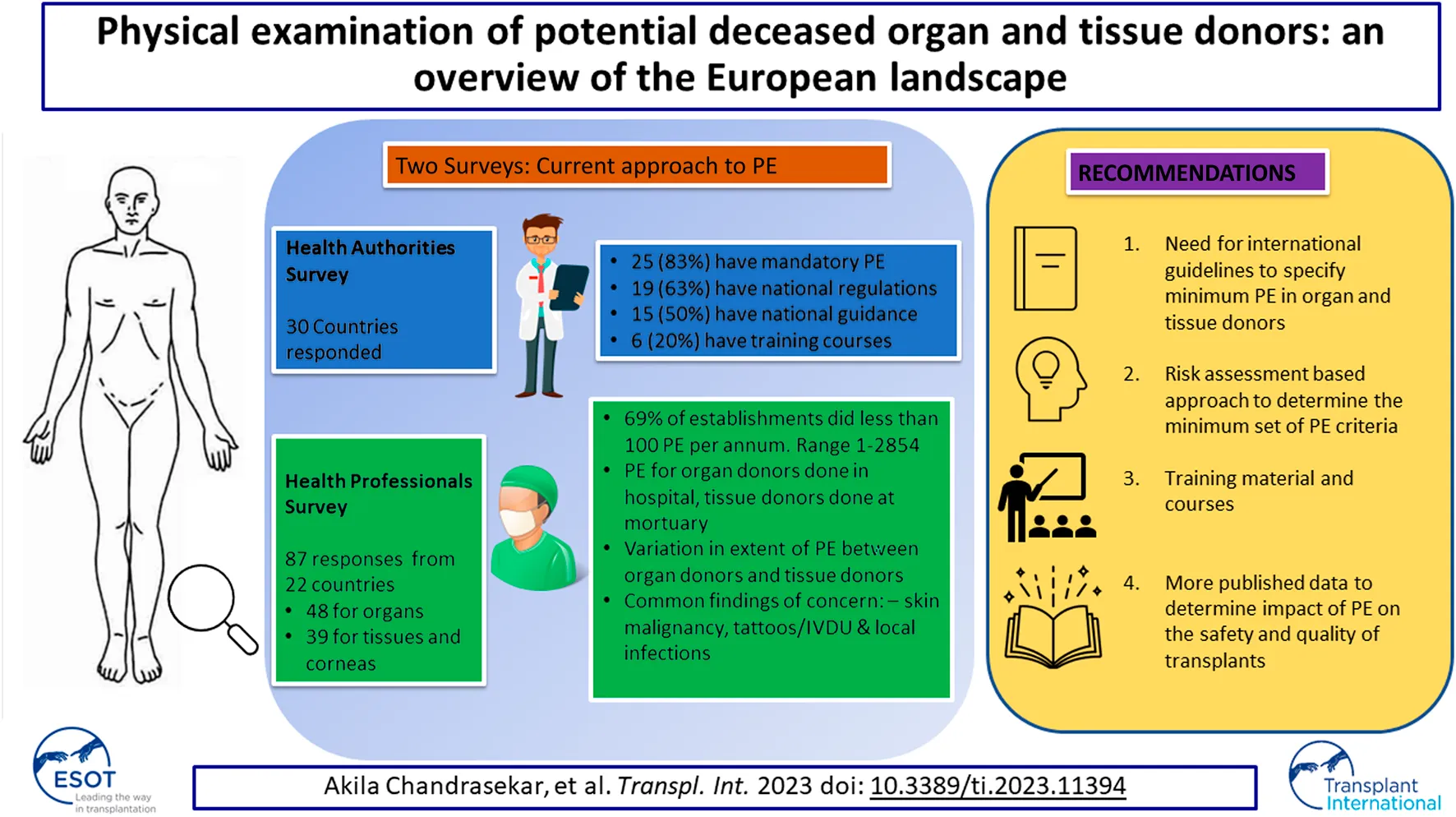 Chandrasekar A, Lomas R, Sánchez-Ibáñez J, Lomero M, Bokhorst A, Ivo Da Silva M, Trias E, Pérez Blanco A, Domínguez-Gil B and López-Fraga M (2023) Physical Examination of Potential Deceased Organ and Tissue Donors: An Overview of the European Landscape. Transpl Int 36:11394. doi: 10.3389/ti.2023.11394