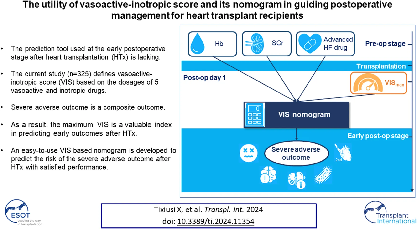Xiong T, Yim WY, Chi J, Wang Y, Lan H, Zhang J, Sun Y, Shi J, Chen S and Dong N (2024) The Utility of the Vasoactive-Inotropic Score and Its Nomogram in Guiding Postoperative Management in Heart Transplant Recipients. Transpl Int 37:11354. doi: 10.3389/ti.2024.11354