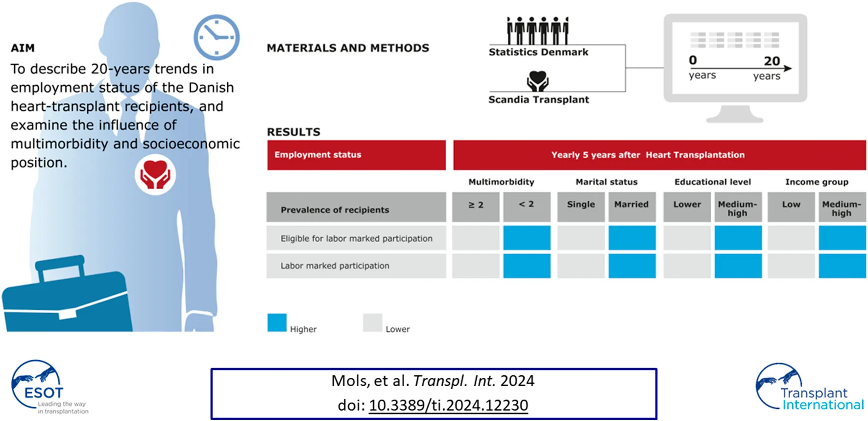Mols RE, Løgstrup BB, Bakos I, Horváth-Puhó E, Gustafsson F and Eiskjær H (2024) Employment Status Following Heart Transplantation: Data From the Danish Nationwide Social Service Payment Register During 20 years. Transpl Int 37:12230. doi: 10.3389/ti.2024.12230