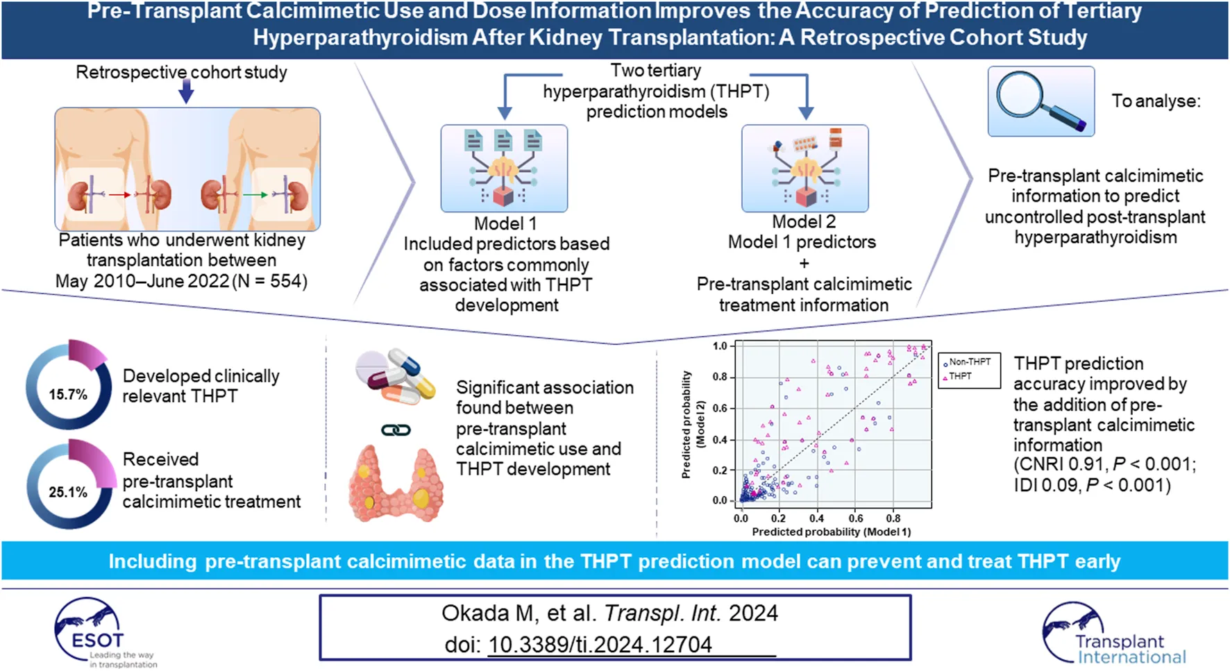 Okada M, Sato T, Himeno T, Hasegawa Y, Futamura K, Hiramitsu T, Ichimori T, Goto N, Narumi S and Watarai Y (2024) Pre-Transplant Calcimimetic Use and Dose Information Improves the Accuracy of Prediction of Tertiary Hyperparathyroidism after Kidney Transplantation: A Retrospective Cohort Study. Transpl Int 37:12704. doi: 10.3389/ti.2024.12704