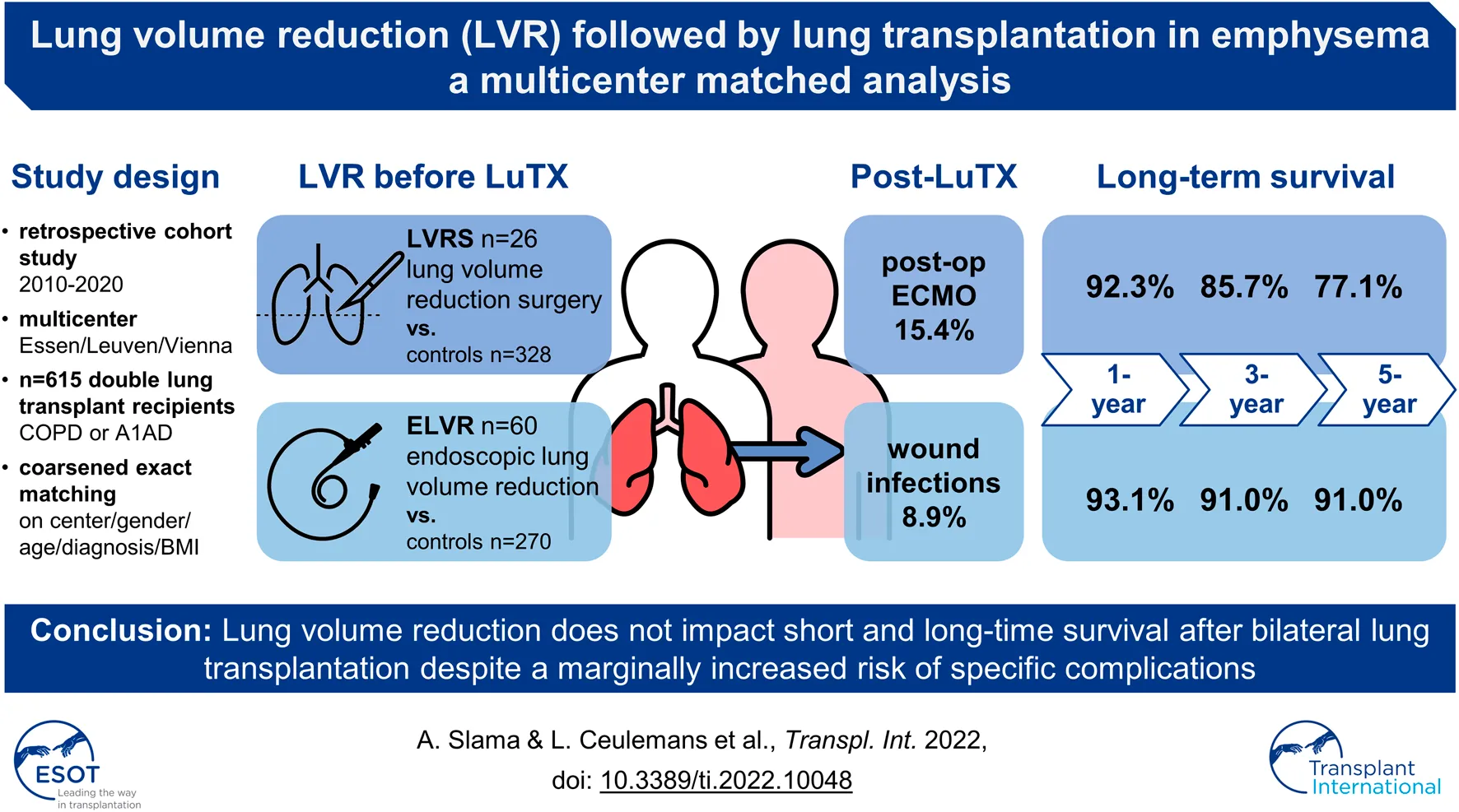 Slama A, Ceulemans LJ, Hedderich C, Boehm PM, Van Slambrouck J, Schwarz S, Vandervelde CM, Kamler M, Jaksch P, Van Raemdonck D, Hoetzenecker K and Aigner C (2022) Lung Volume Reduction Followed by Lung Transplantation in Emphysema—A Multicenter Matched Analysis. Transpl Int 35:10048. doi: 10.3389/ti.2022.10048