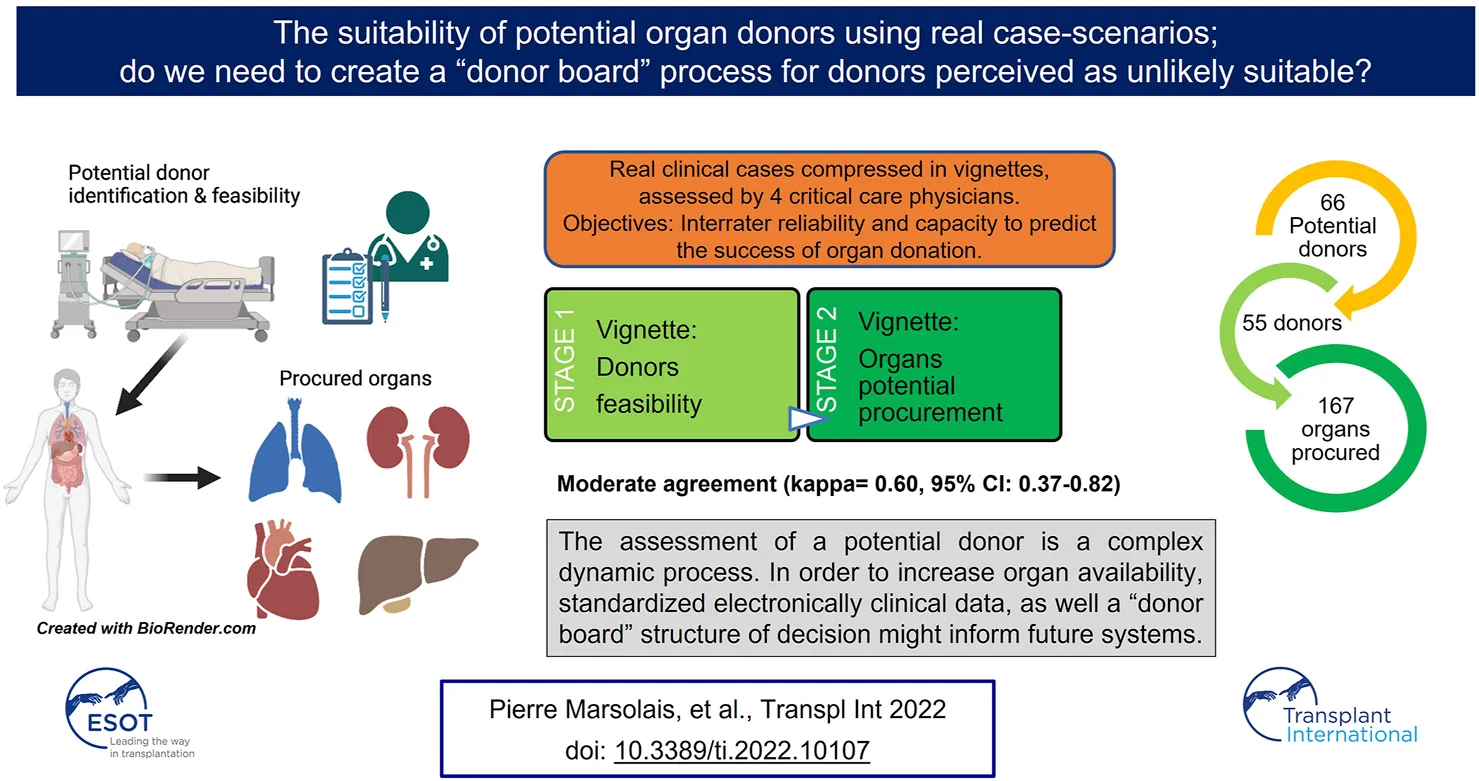 Marsolais P, Larouche G, Lagacé A-M, Williams V, Serri K, Bernard F, Rico P, Frenette AJ, Williamson D, Albert M and Charbonney E (2022) The Suitability of Potential Organ Donors Using Real Case-Scenarios; Do we Need to Create a “Donor Board” Process for Donors Perceived as Unlikely Suitable?. Transpl Int 35:10107. doi: 10.3389/ti.2022.10107