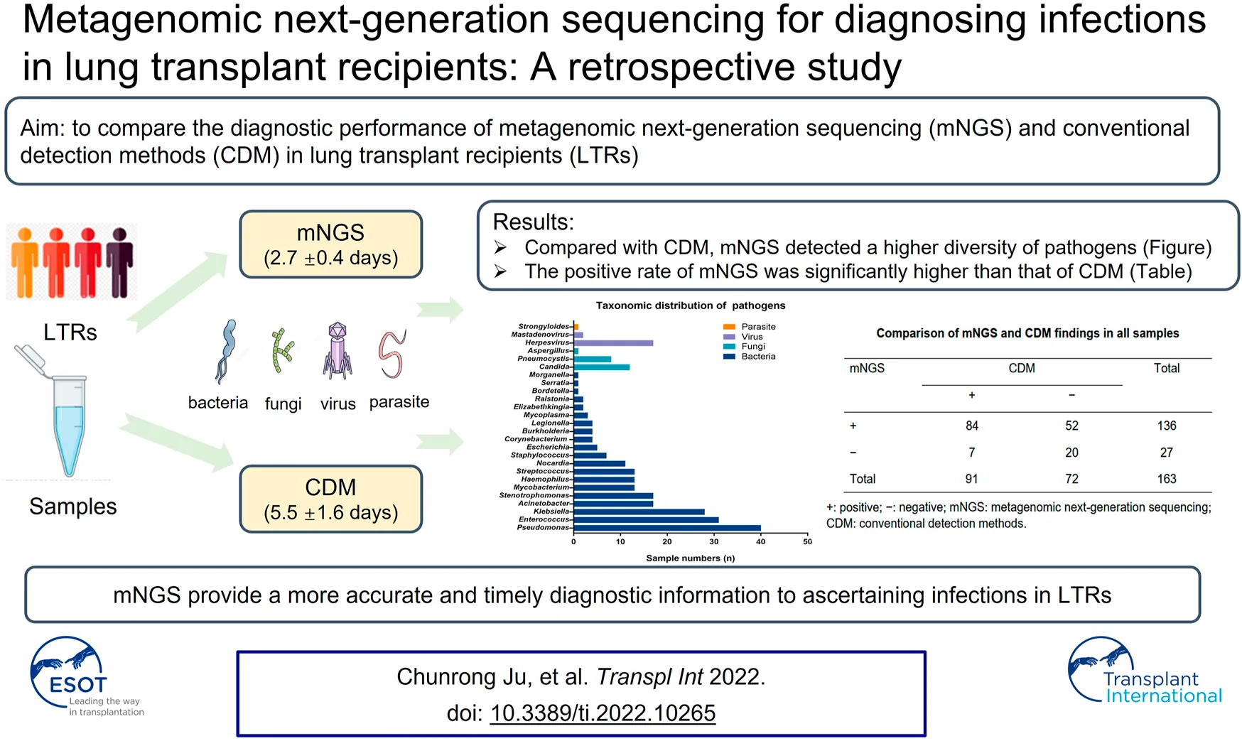 Ju C-R, Lian Q-Y, Guan W-J, Chen A, Zhang J-H, Xu X, Chen R-C, Li S-Y and He J-X (2022) Metagenomic Next-Generation Sequencing for Diagnosing Infections in Lung Transplant Recipients: A Retrospective Study. Transpl Int 35:10265. doi: 10.3389/ti.2022.10265