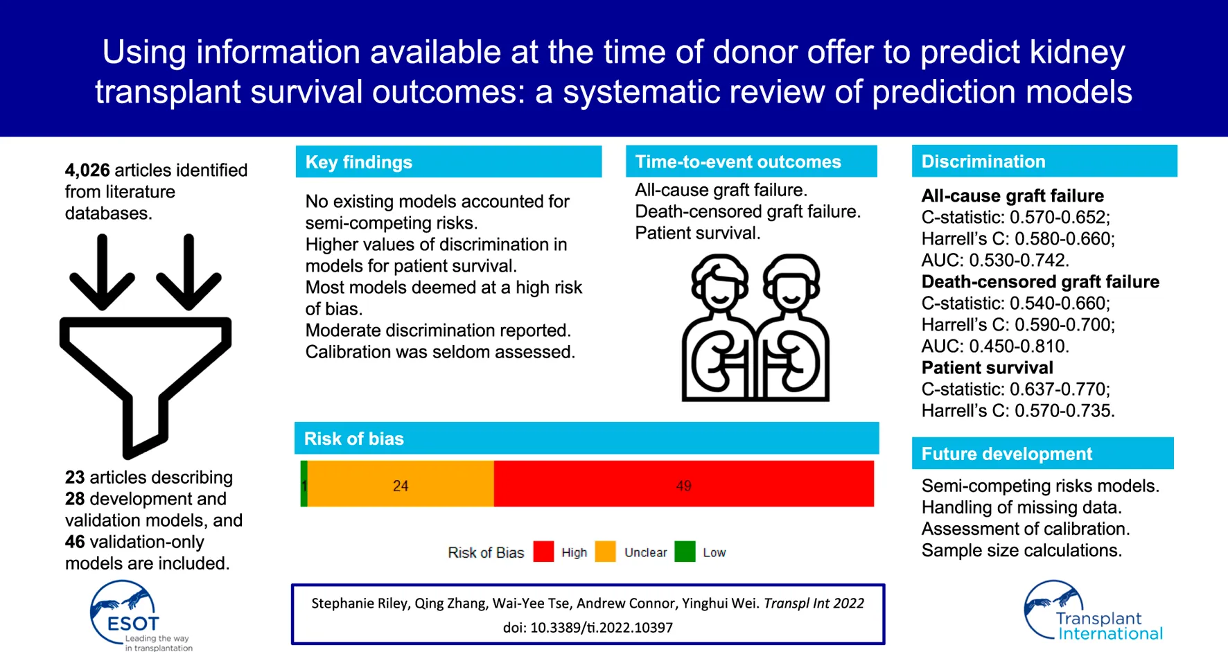 Riley S, Zhang Q, Tse W-Y, Connor A and Wei Y (2022) Using Information Available at the Time of Donor Offer to Predict Kidney Transplant Survival Outcomes: A Systematic Review of Prediction Models. Transpl Int 35:10397. doi: 10.3389/ti.2022.10397