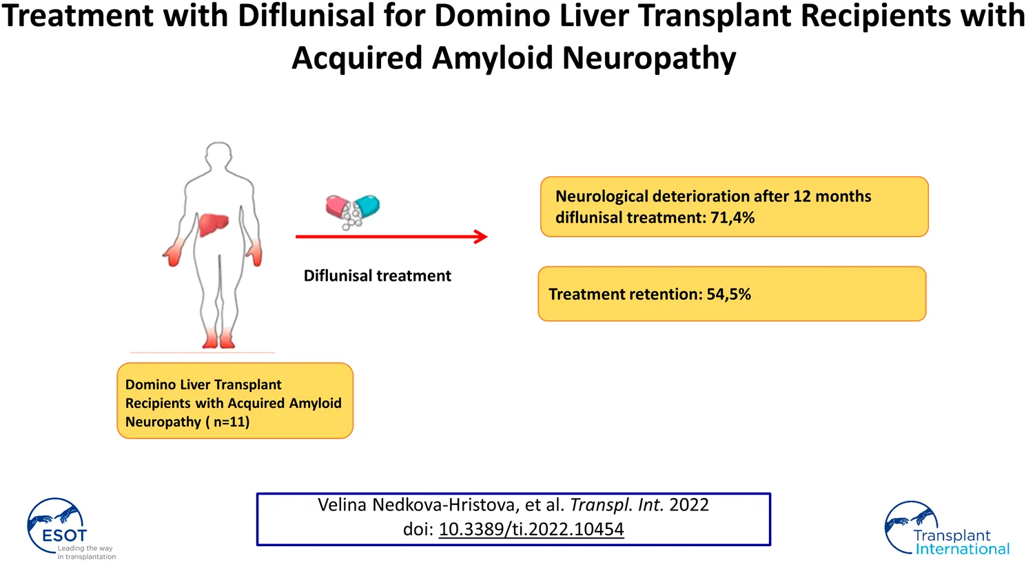 Conclusion: Our study suggests that most domino liver transplant recipients with acquired amyloid neuropathy will develop neurological deterioration by 12 months of treatment with diflunisal. This therapy was also associated with a high incidence of adverse effects and low treatment retention. The low efficacy and low tolerability of diflunisal treatment encourage the search for new therapeutic options.