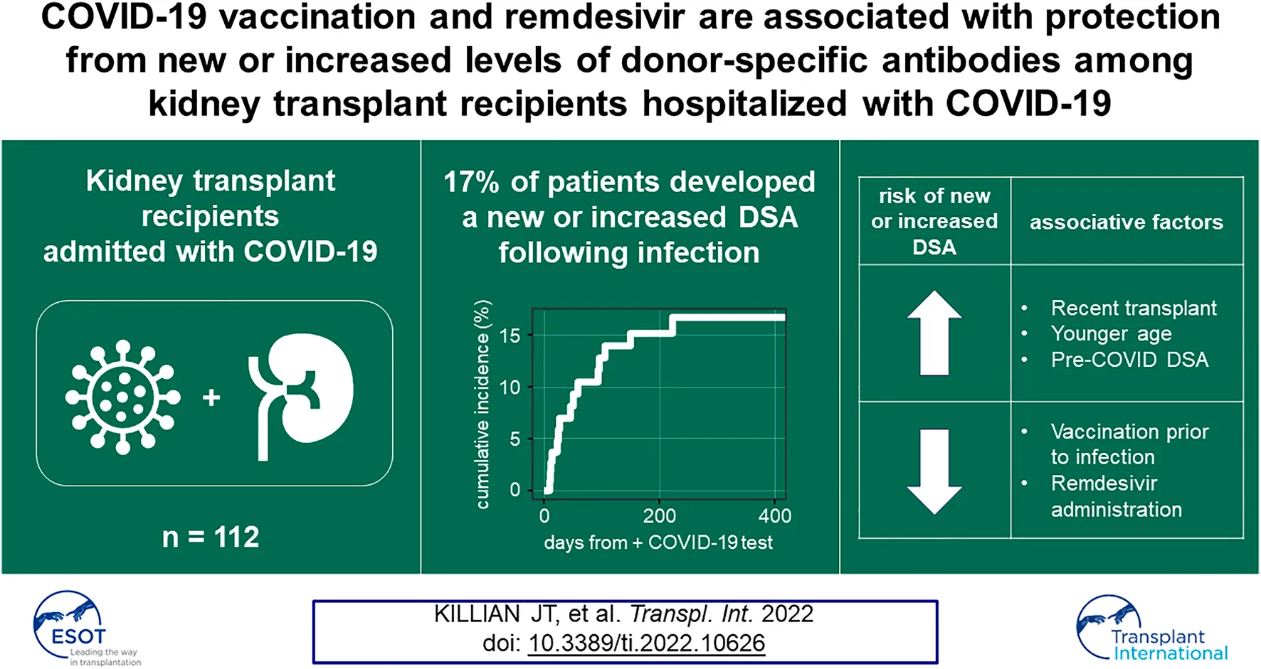 Killian JT, Houp JA, Burkholder GA, Roman Soto SA, Killian AC, Ong SC, Erdmann NB, Goepfert PA, Hauptfeld-Dolejsek V, Leal SM, Zumaquero E, Nellore A, Agarwal G, Kew CE, Orandi BJ, Locke JE, Porrett PM, Levitan EB, Kumar V and Lund FE (2022) COVID-19 Vaccination and Remdesivir are Associated With Protection From New or Increased Levels of Donor-Specific Antibodies Among Kidney Transplant Recipients Hospitalized With COVID-19. Transpl Int 35:10626. doi: 10.3389/ti.2022.10626