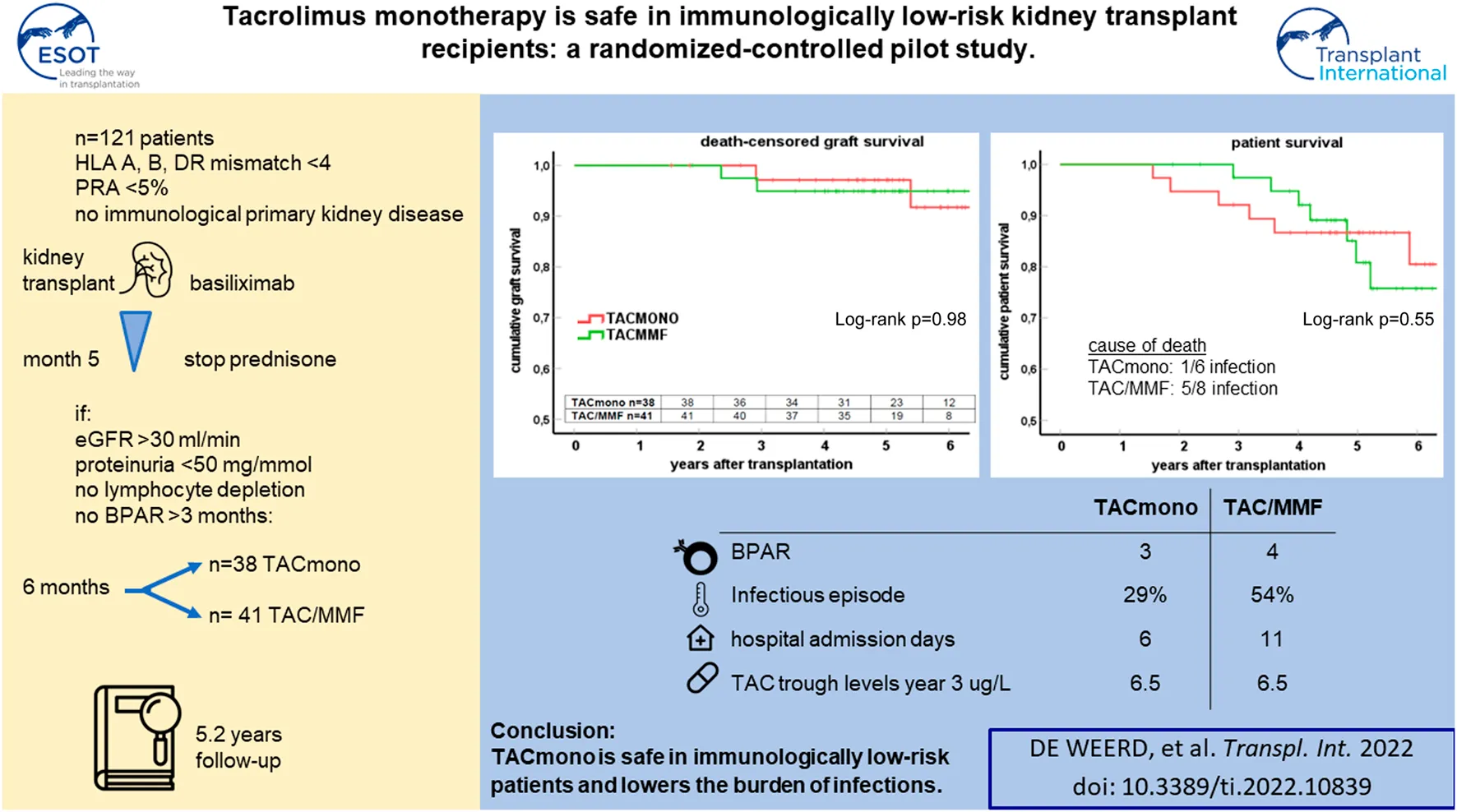 de Weerd AE, Fatly ZA, Boer-Verschragen M, Kal-van Gestel JA, Roelen DL, Dieterich M and Betjes MGH (2022) Tacrolimus Monotherapy is Safe in Immunologically Low-Risk Kidney Transplant Recipients: A Randomized-Controlled Pilot Study. Transpl Int 35:10839. doi: 10.3389/ti.2022.10839