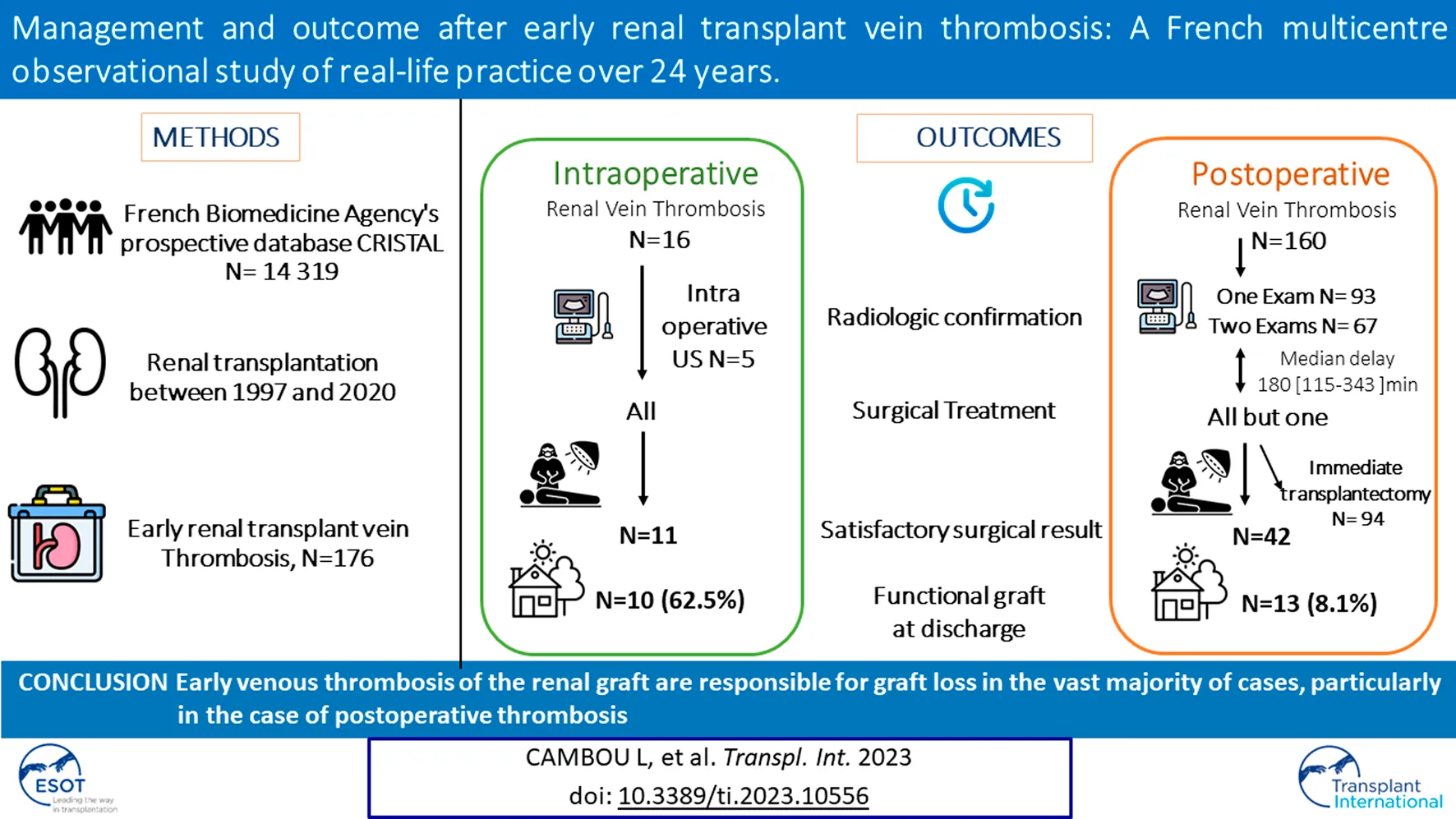 Cambou L, Millet C, Terrier N, Malvezzi P, Timsit M-O, Anglicheau D, Badet L, Morelon E, Prudhomme T, Kamar N, Lejay A, Perrin P, Uro-Coste C, Pereira B, Heng AE, Garrouste C and Guy L (2023) Management and Outcome After Early Renal Transplant Vein Thrombosis: A French Multicentre Observational Study of Real-Life Practice Over 24 Years. Transpl Int 36:10556. doi: 10.3389/ti.2023.10556