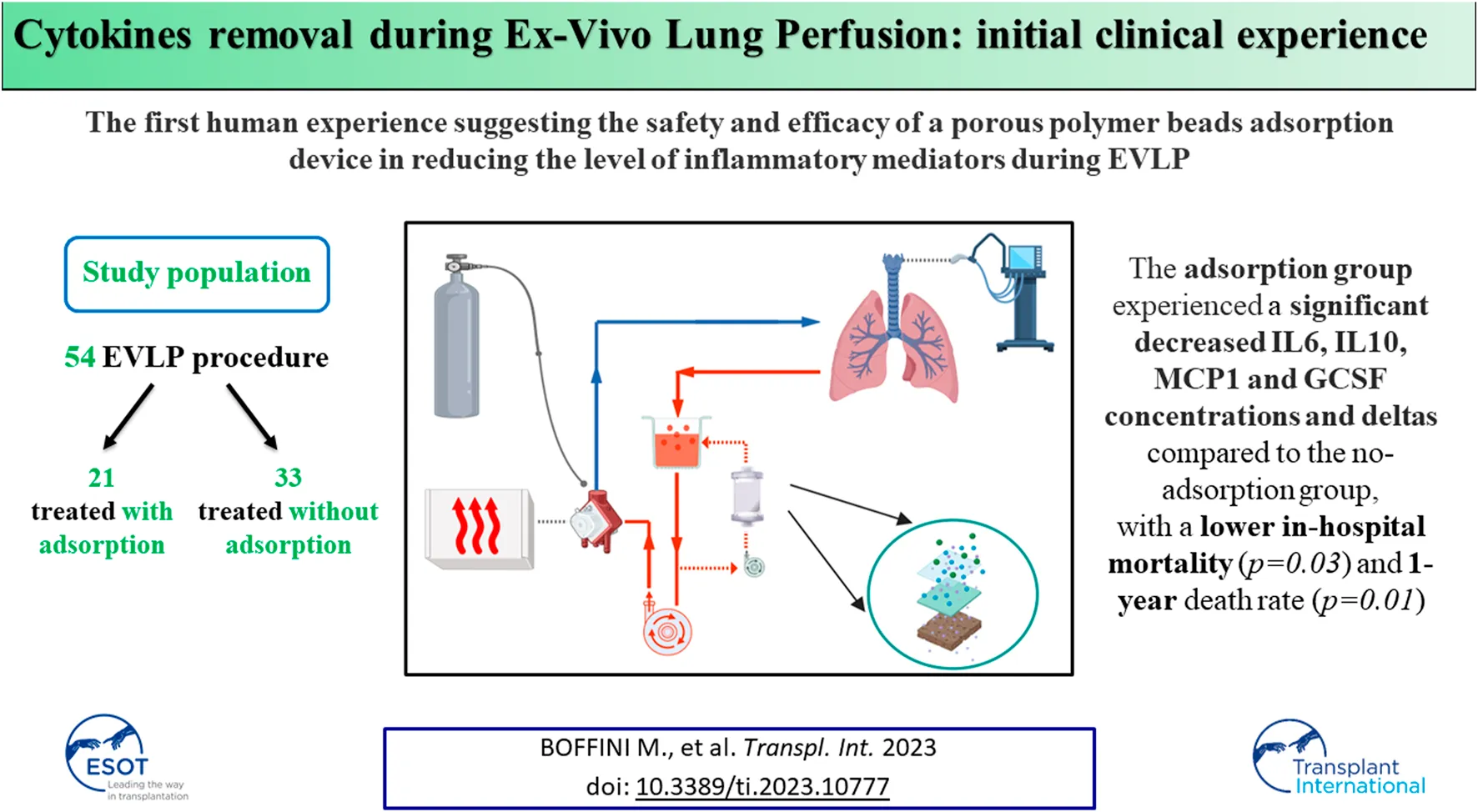 The main finding of our initial clinical series is that the reduction of the level of inflammatory mediators can be effectively achieved using a porous polymer beads adsorption during EVLP with the use of CytoSorb® in the clinical setting of lung transplantation and this represents the first experience reported in man so far.