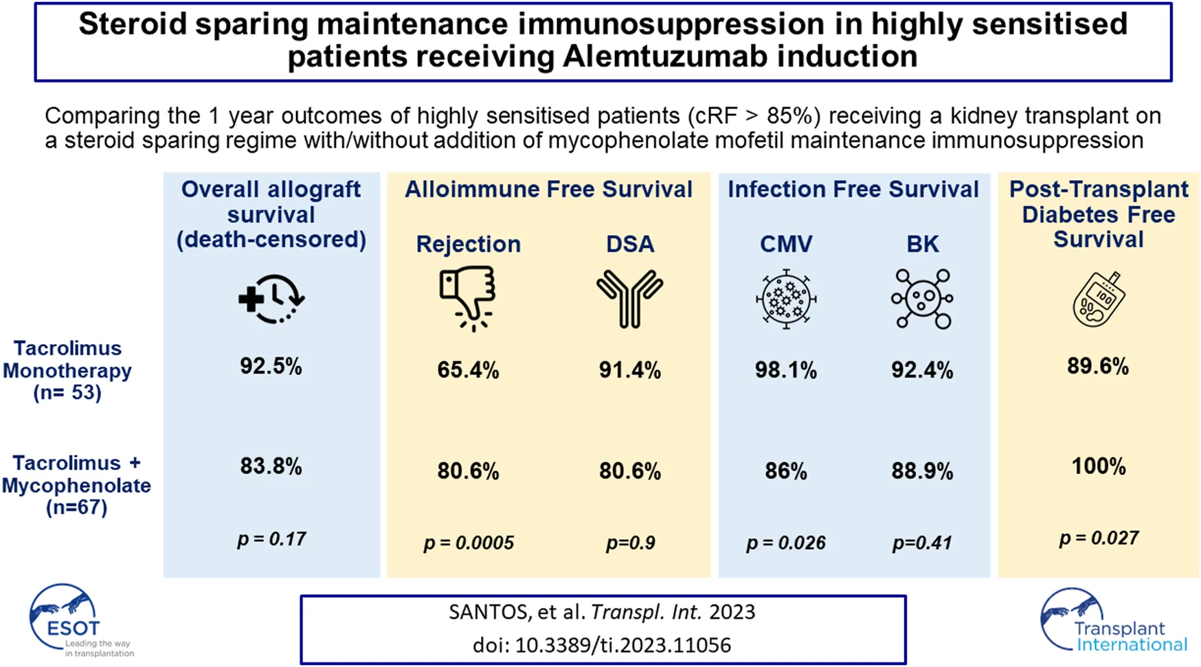 Santos E, Spensley K, Gunby N, Clarke C, Anand A, Roufosse C and Willicombe M (2023) Steroid Sparing Maintenance Immunosuppression in Highly Sensitised Patients Receiving Alemtuzumab Induction. Transpl Int 36:11056. doi: 10.3389/ti.2023.11056