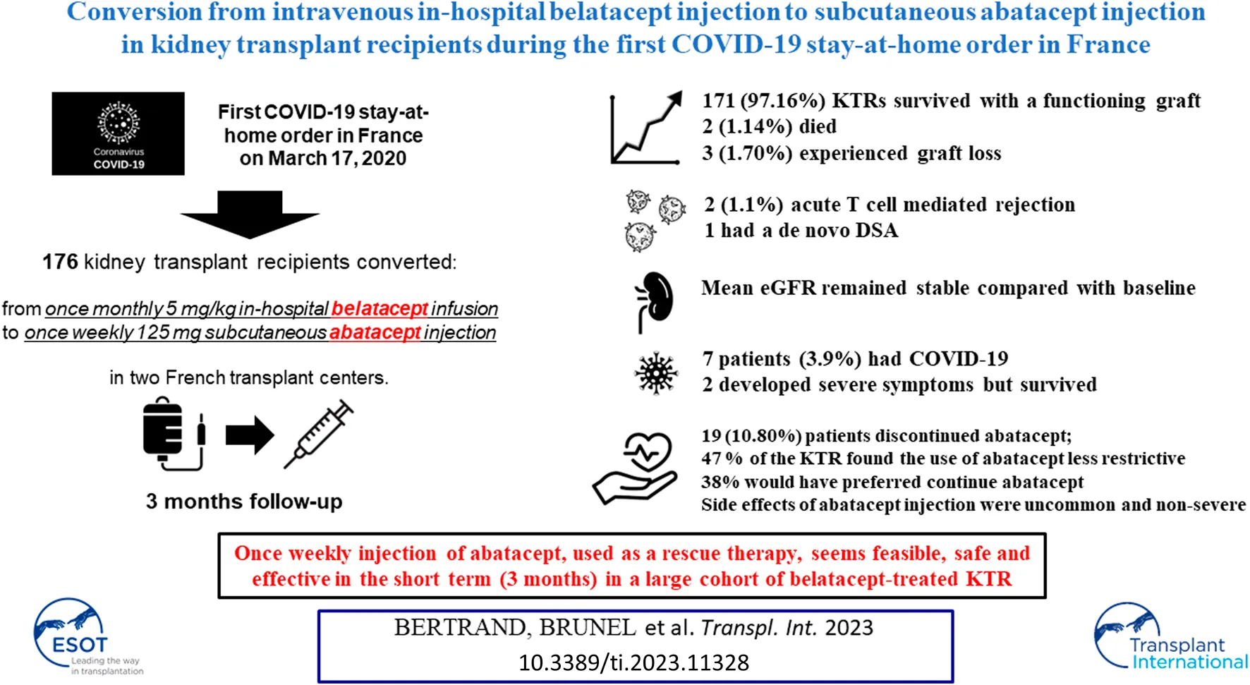 Bertrand D, Brunel M, Lebourg L, Scemla A, Lemoine M, Amrouche L, Laurent C, Legendre C, Guerrot D, Anglicheau D and Sberro-Soussan R (2023) Conversion From Intravenous In-Hospital Belatacept Injection to Subcutaneous Abatacept Injection in Kidney Transplant Recipients During the First COVID-19 Stay-at-Home Order in France. Transpl Int 36:11328. doi: 10.3389/ti.2023.11328