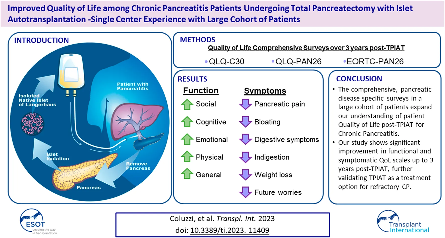 Coluzzi M, Takita M, Saracino G, Rub Hakim Mohammed A, Darden CM, Testa G, Beecherl E, Onaca N and Naziruddin B (2023) Improved Quality of Life Among Chronic Pancreatitis Patients Undergoing Total Pancreatectomy With Islet Autotransplantation—Single Center Experience With Large Cohort of Patients. Transpl Int 36:11409. doi: 10.3389/ti.2023.11409