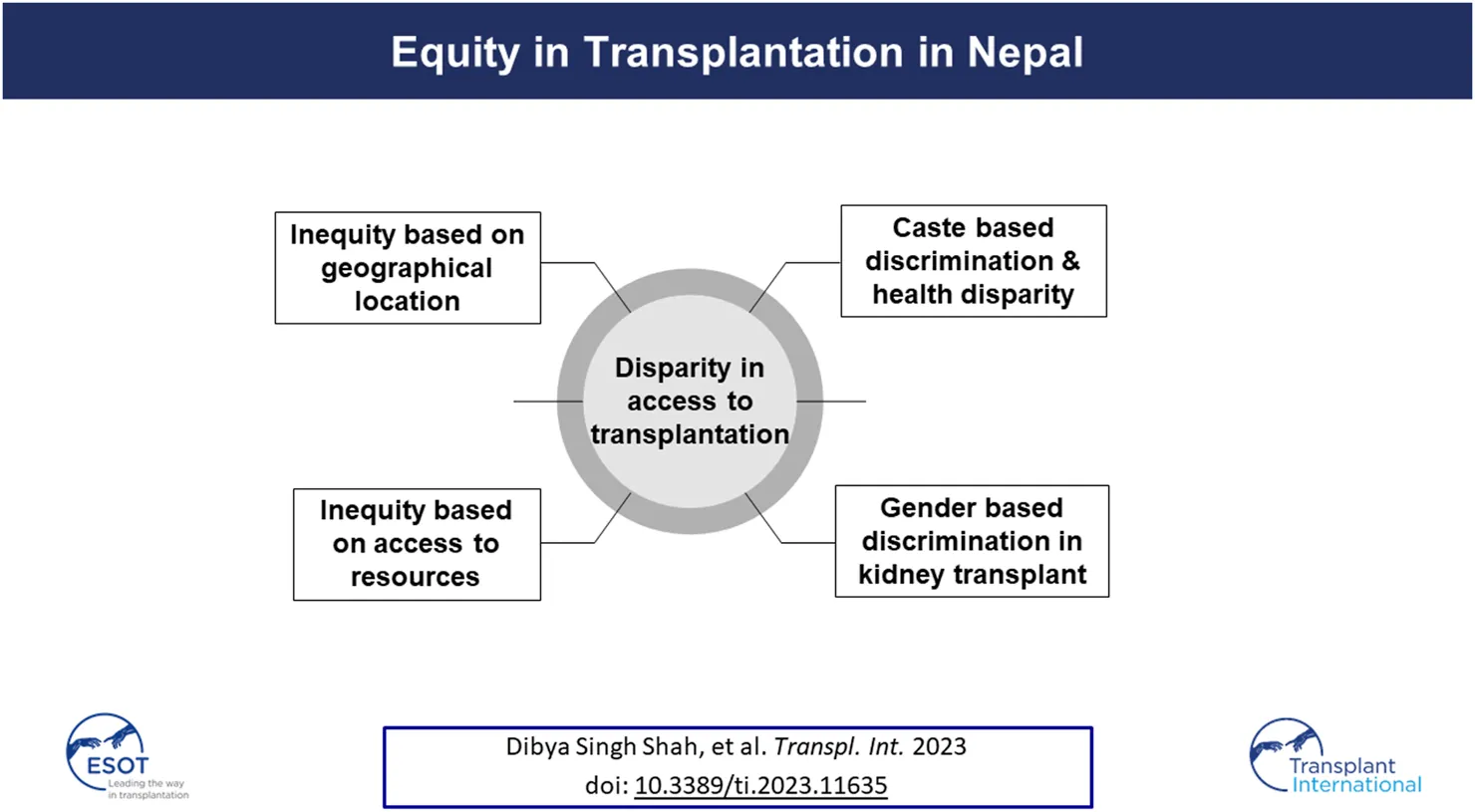 Nepal’s only established organ transplantation program is kidney transplantation. Despite notable progress in this field, significant disparities in access persist, with resources concentrated in urban centers. This leaves rural, vulnerable, and marginalized groups underserved.