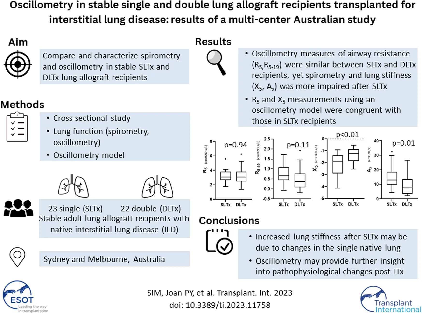 Sim JPY, Nilsen K, Borg BM, Levvey B, Vazirani J, Ennis S, Plit M, Snell GI, Darley DR and Tonga KO (2023) Oscillometry in Stable Single and Double Lung Allograft Recipients Transplanted for Interstitial Lung Disease: Results of a Multi-Center Australian Study. Transpl Int 36:11758. doi: 10.3389/ti.2023.11758