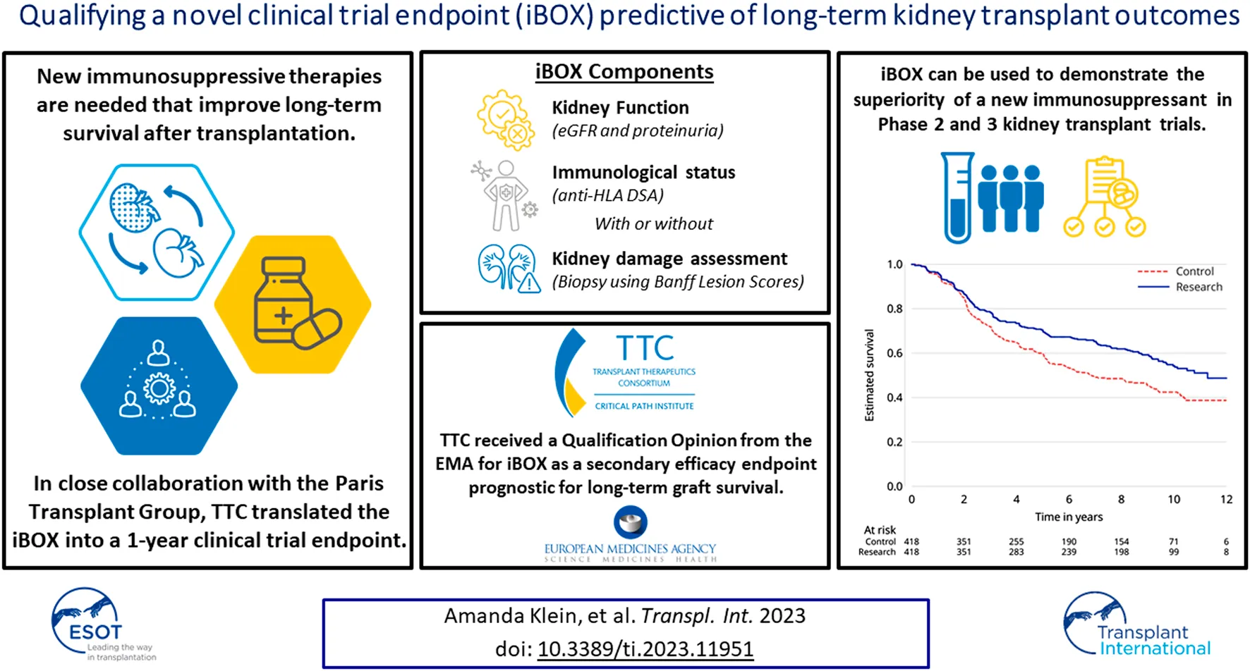 New immunosuppressive therapies that improve long-term graft survival are needed in kidney transplant. Critical Path Institute’s Transplant Therapeutics Consortium received a qualification opinion for the iBOX Scoring System as a novel secondary efficacy endpoint for kidney transplant clinical trials through European Medicines Agency’s qualification of novel methodologies for drug development. This is the first qualified endpoint for any transplant indication and is now available for use in kidney transplant clinical trials. Although the current efficacy failure endpoint has typically shown the noninferiority of therapeutic regimens, the iBOX Scoring System can be used to demonstrate the superiority of a new immunosuppressive therapy compared to the standard of care from 6 months to 24 months posttransplant in pivotal or exploratory drug therapeutic studies.
