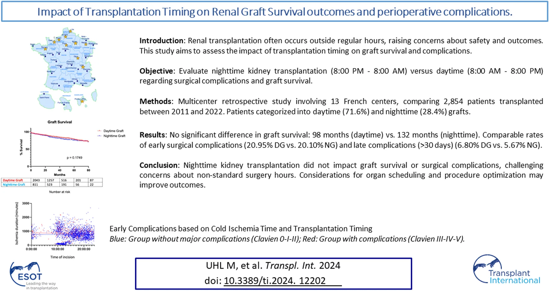 This French multicenter study is one of the most comprehensive analyses to date regarding the impact of transplantation timing on renal graft survival and early and late surgical complications. Organ transplantation outcomes are inconsistent, with liver grafts showing negative effects of nocturnal interventions [16], while cardiac and lung grafts remain unaffected [17]. Cold ischemia time significantly influences long-term renal graft survival [18–21]. However, surgical complications necessitating subsequent interventions have been linked to reduced graft survival [8, 22, 23], particularly vascular complications [24] and increased operative time [25]. Despite multiple retrospective analyses, these studies are often limited by small cohorts, leading to non-significant results [11–14]. Only three retrospective studies have yielded significant outcomes concerning complication rates and graft survival for nighttime kidney transplants.