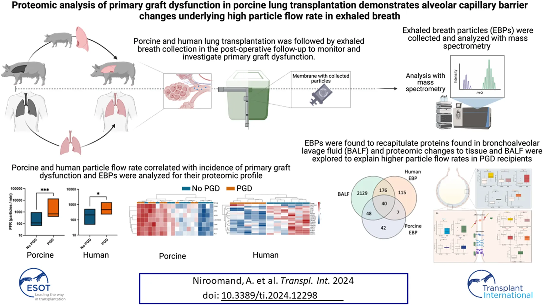 Niroomand A, Hirdman G, Bèchet N, Ghaidan H, Stenlo M, Kjellström S, Isaksson M, Broberg E, Pierre L, Hyllén S, Olm F and Lindstedt S (2024) Proteomic Analysis of Primary Graft Dysfunction in Porcine Lung Transplantation Reveals Alveolar-Capillary Barrier Changes Underlying the High Particle Flow Rate in Exhaled Breath. Transpl Int 37:12298. doi: 10.3389/ti.2024.12298