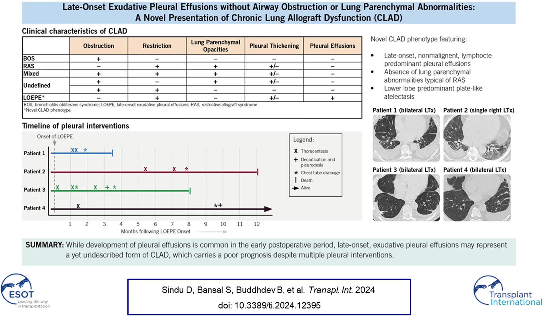 Sindu D, Bansal S, Buddhdev B, McAnally K, Mohamed H, Walia R, Mohanakumar T and Tokman S (2024) Late-Onset Exudative Pleural Effusions Without Concomitant Airway Obstruction or Lung Parenchymal Abnormalities: A Novel Presentation of Chronic Lung Allograft Dysfunction. Transpl Int 37:12395. doi: 10.3389/ti.2024.12395