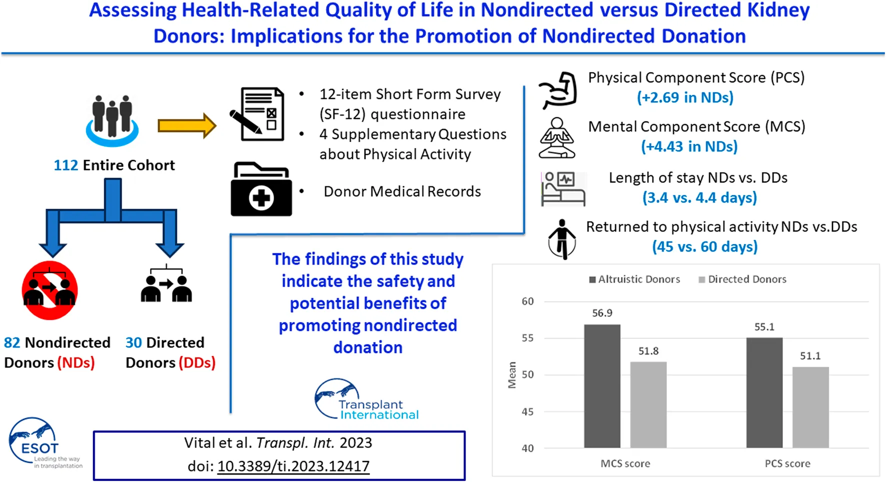 Importantly, the findings of this study endorse the continued use of non-directed donors, given the enhanced physical and mental HRQoL observed after donation, indicating that the donation process has no negative impact on their physical or mental wellbeing. In fact, carefully screened donors do not suffer any adverse physical or psychological consequences from donating to a stranger. Nevertheless, it is crucial to emphasize the benefits of living related donors, such as the improved HLA matching within families that leads to lower rejection rates and improved long-term outcomes. As healthcare providers, we strongly believe that safeguarding the wellbeing of all donors, particularly those motivated by altruism, is our fundamental duty. To minimize the risk of adverse health consequences post-donation and prevent any potential future harm, selecting non-directed donors should involve meticulous screening and a more stringent process. Moreover, it is imperative to ensure that the eagerness of non-directed donors to help others is not exploited or manipulated in any way. Therefore, the use of non-directed kidney donation should be considered only as a last resort after exhausting all possible options to secure a donation within the family.