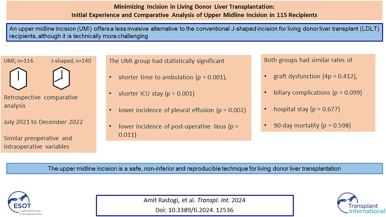 Rastogi A, Gupta AA, Bansal R, Kollanta Valappil F, Yadav KS, Chaudhary S, Bhangui P, Dhampalvar S, Choudhary NS, Saraf N and Soin AS (2024) Minimizing Incision in Living Donor Liver Transplantation: Initial Experience and Comparative Analysis of Upper Midline Incision in 115 Recipients. Transpl Int 37:12536. doi: 10.3389/ti.2024.12536
