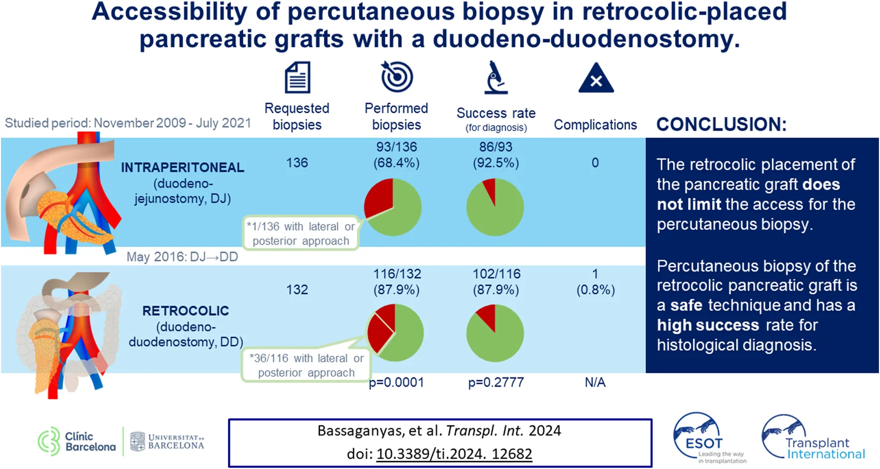 Bassaganyas C, Darnell A, Soler-Perromat A, Rafart G, Ventura-Aguiar P, Cuatrecasas M, Ferrer-Fàbrega J, Ayuso C and García-Criado Á (2024) Accessibility of Percutaneous Biopsy in Retrocolic-Placed Pancreatic Grafts With a Duodeno-Duodenostomy. Transpl Int 37:12682. doi: 10.3389/ti.2024.12682