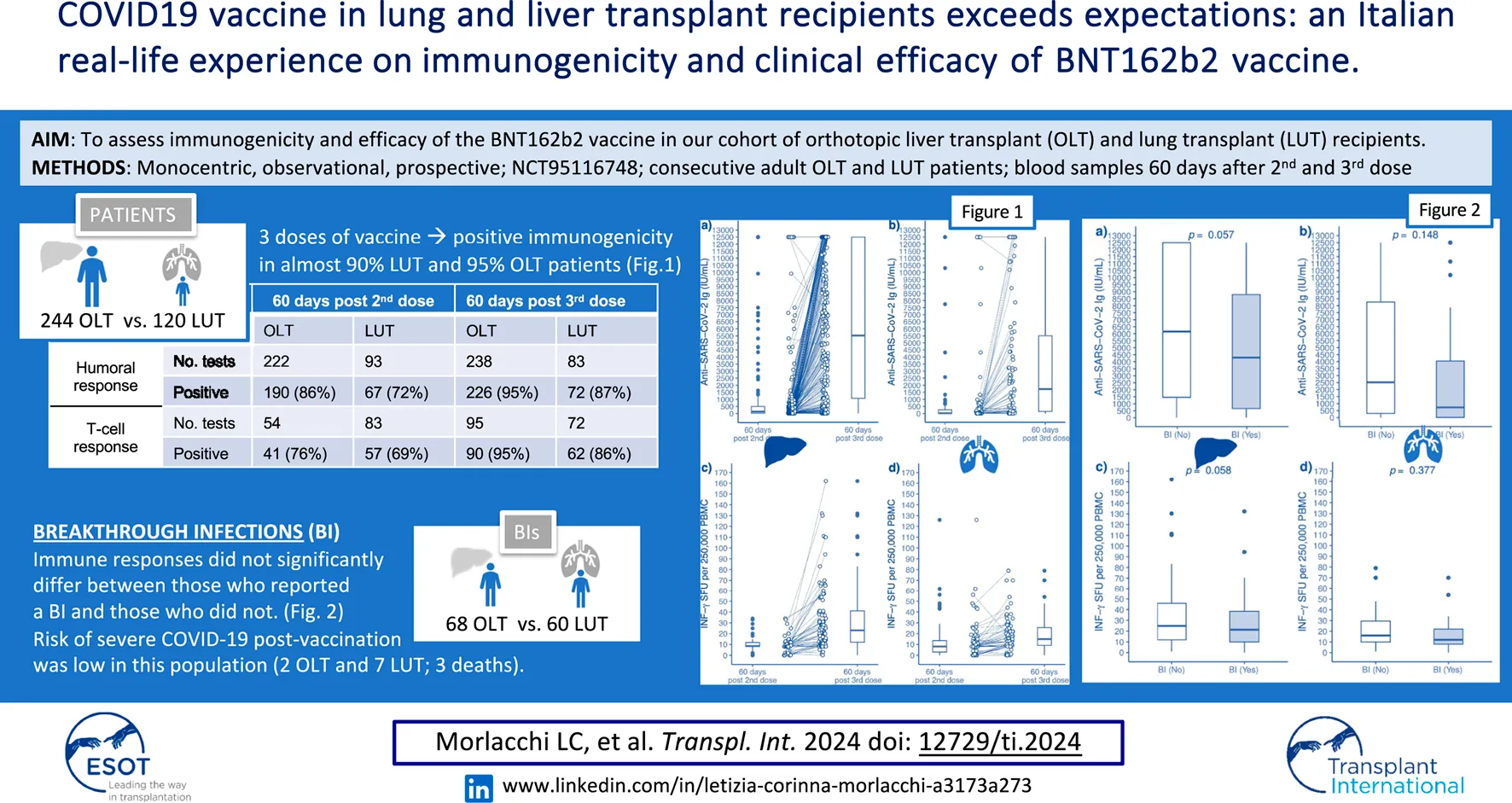 Morlacchi LC, Alicandro G, Uceda Renteria S, Zignani N, Giacomel G, Rossetti V, Sagasta M, Citterio G, Lombardi A, Dibenedetto C, Antonelli B, Rosso L, Lampertico P, Ceriotti F, Blasi F and Donato MF (2024) COVID-19 Vaccine in Lung and Liver Transplant Recipients Exceeds Expectations: An Italian Real-Life Experience on Immunogenicity and Clinical Efficacy of BNT162b2 Vaccine. Transpl Int 37:12729. doi: 10.3389/ti.2024.12729