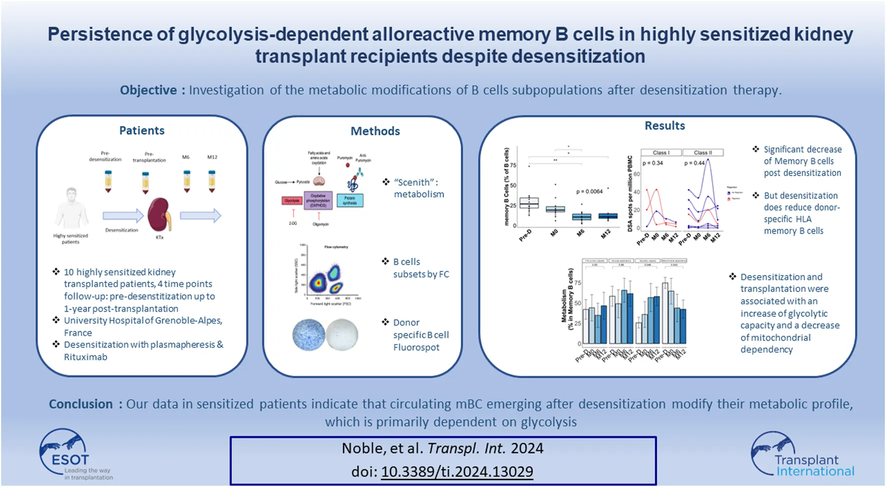 Noble J, Cabezas L, Truffot A, Dumolard L, Jouve T, Malvezzi P, Rostaing L, Dard C, Saas P, Cravedi P and Macek-Jilkova Z (2024) Glycolysis Changes in Alloreactive Memory B Cells in Highly Sensitized Kidney Transplant Recipients Undergoing Desensitization Therapy. Transpl Int 37:13029. doi: 10.3389/ti.2024.13029