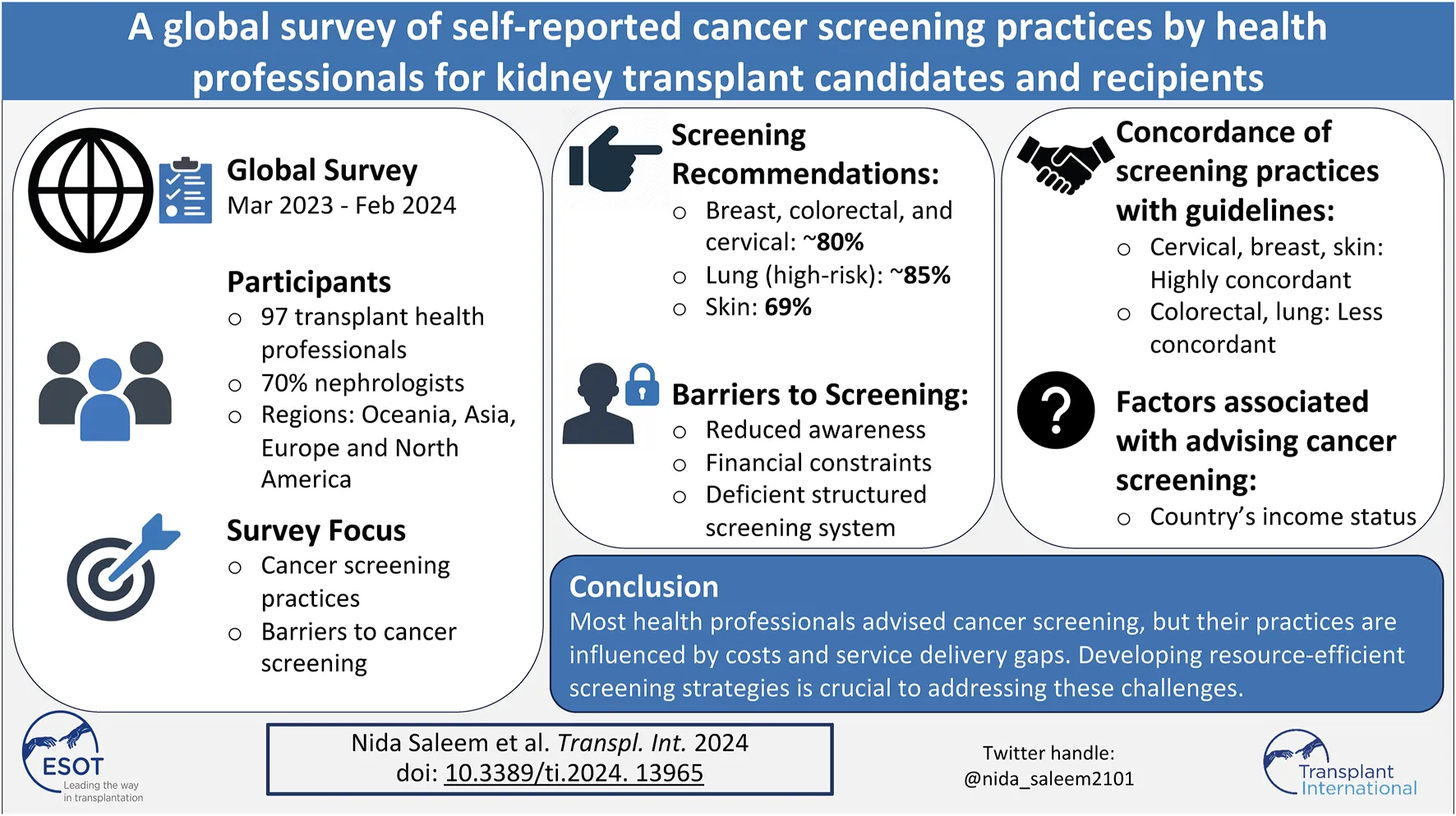 Saleem N, Lim WH, Stephens JH, Wilson A, Bonevski B, Jaure A, Teixeira-Pinto A, Dal Grande E, Howell M, Boroumand F, van Zwieten A, Guha C, Scholes-Robertson N, Chadban SJ, Hawley CM, Craig JC, Chapman JR, Hassan D, Knoll G, Murakami N and Wong G (2025) A Global Survey of Self-Reported Cancer Screening Practices by Health Professionals for Kidney Transplant Candidates and Recipients. Transpl Int 37:13965. doi: 10.3389/ti.2024.13965