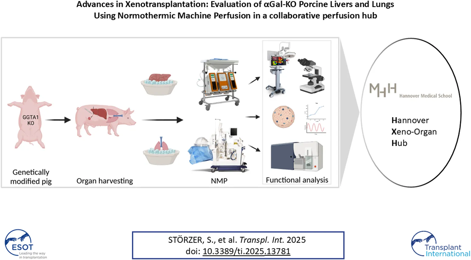 Stoerzer S, Kruszona S, Wand P, Linge H, Zlatev H, Hoeffler K, Singh J, Roters N, Muth V, Tavil S, Saipbaev A, Cvitkovic K, Kues WA, Zardo P, Ius F, Mengwasser J, Splith K, Schmidt-Ott KM, Goecke T, Schwinzer R, Niemann H, Ruhparwar A, Schmelzle M, Ramm R and Felgendreff P (2025) Advances in Xenotransplantation: Evaluation of αGal-KO Porcine Livers and Lungs Using Normothermic Machine Perfusion in a Collaborative Perfusion Hub. Transpl Int 38:13781. doi: 10.3389/ti.2025.13781