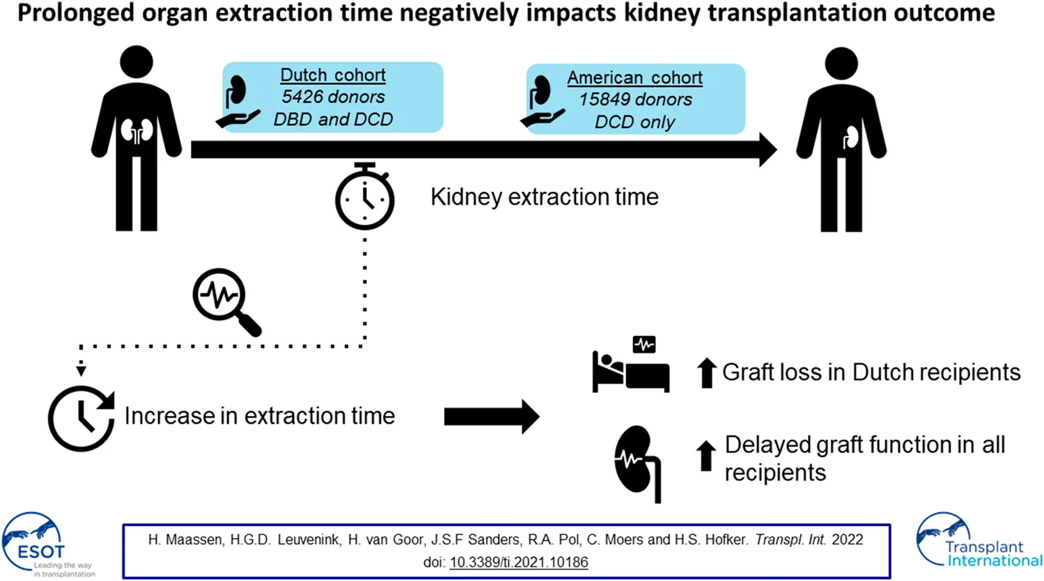Maassen H, Leuvenink HGD, van Goor H, Sanders J-SF, Pol RA, Moers C and Hofker HS (2022) Prolonged Organ Extraction Time Negatively Impacts Kidney Transplantation Outcome. Transpl Int 35:10186. doi: 10.3389/ti.2021.10186