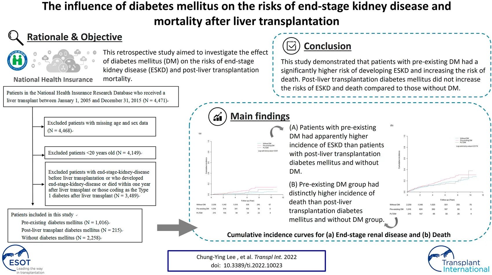 Lee C-Y, Wu M-Y, Chan H-C, Chen T-T, Hsu L-Y, Wu M-S and Cherng Y-G (2022) The Influence of Diabetes Mellitus on the Risks of End-Stage Kidney Disease and Mortality After Liver Transplantation. Transpl Int 35:10023. doi: 10.3389/ti.2022.10023