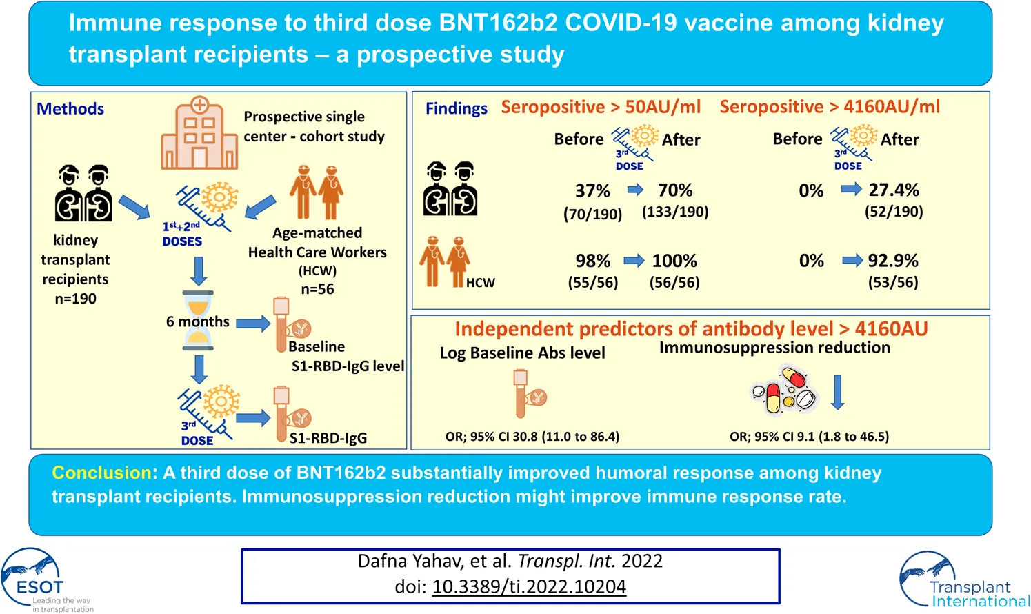 Yahav D, Rahamimov R, Mashraki T, Ben-Dor N, Steinmetz T, Agur T, Zingerman B, Herman-Edelstein M, Lichtenberg S, Ben-Zvi H, Bar-Haim E, Cohen H, Rotem S, Elia U, Margalit I and Zvi BR (2022) Immune Response to Third Dose BNT162b2 COVID-19 Vaccine Among Kidney Transplant Recipients—A Prospective Study. Transpl Int 35:10204. doi: 10.3389/ti.2022.10204