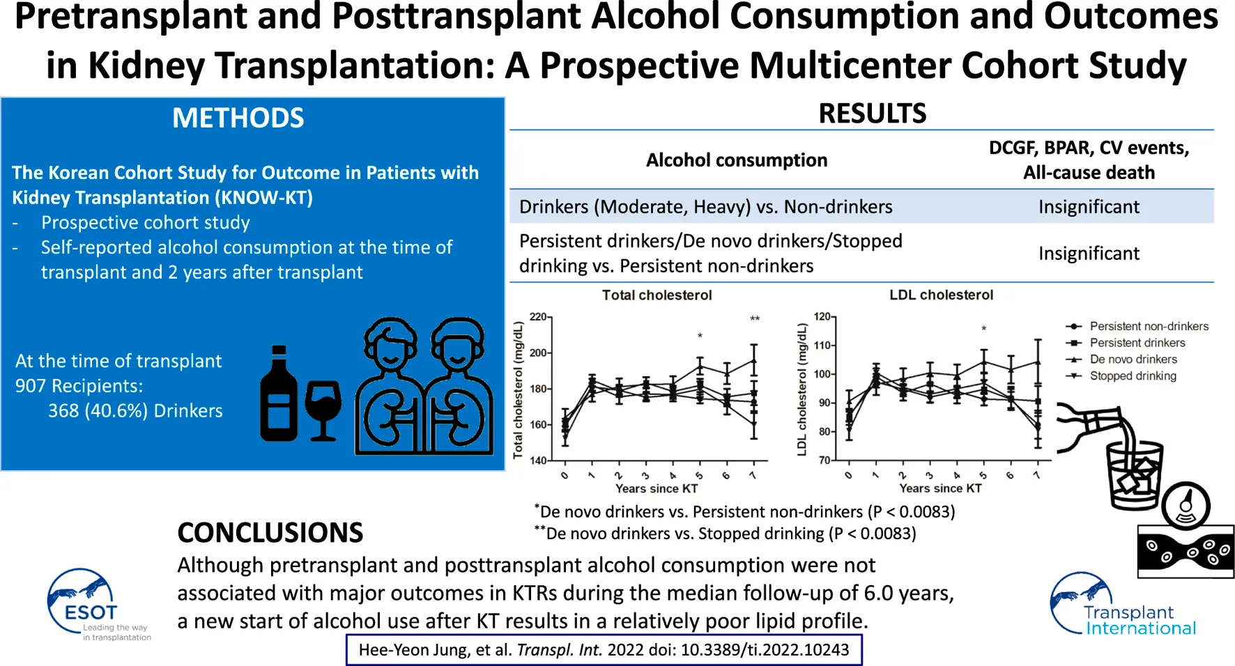 Jung H-Y, Jeon Y, Huh KH, Park JB, Kim M-G, Lee S, Han S, Ro H, Yang J, Ahn C, Cho J-H, Park S-H, Kim Y-L and Kim C-D (2022) Pretransplant and Posttransplant Alcohol Consumption and Outcomes in Kidney Transplantation: A Prospective Multicenter Cohort Study. Transpl Int 35:10243. doi: 10.3389/ti.2022.10243