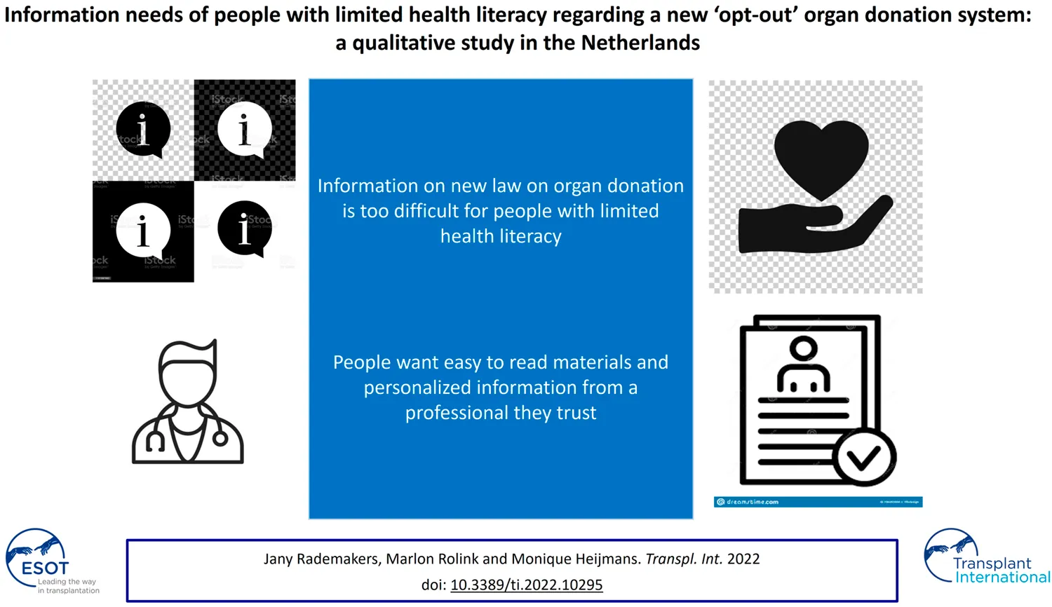 Rademakers J, Rolink M and Heijmans M (2022) Information Needs of People With Limited Health Literacy Regarding a New “Opt-Out” Organ Donation System: A Qualitative Study in the Netherlands. Transpl Int 35:10295. doi: 10.3389/ti.2022.10295