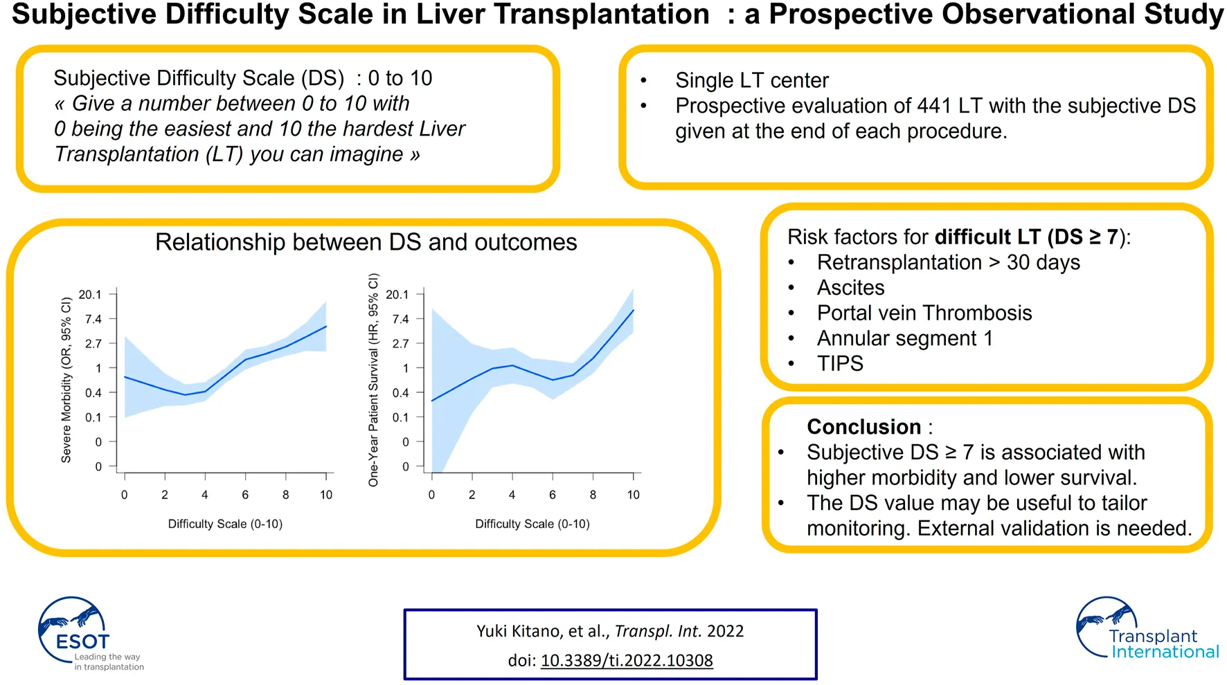 The DS may also be of interest in the early post-transplant period. Some patients after “technically easy” LT are likely good candidates for enhanced recovery protocol, whereas recipients with high DS may potentially benefit from tailored monitoring, including daily Doppler and systematic CT scan. However, the possibility to tailor monitoring according to DS remains a hypothesis, and a more refined difficulty scale (evaluating each step, for example) might be a more efficient approach to anticipate outcomes.