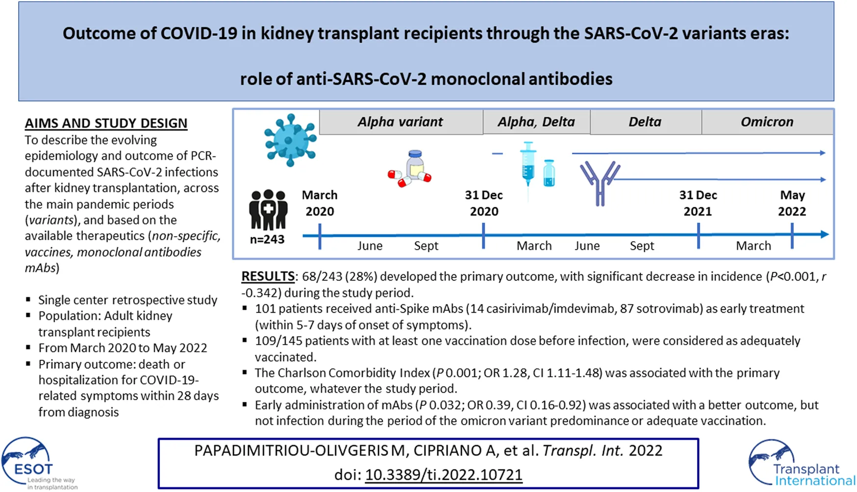Papadimitriou-Olivgeris M, Cipriano A, Guggisberg N, Kroemer M, Tschopp J, Manuel O and Golshayan D (2022) Outcome of COVID-19 in Kidney Transplant Recipients Through the SARS-CoV-2 Variants Eras: Role of Anti-SARS-CoV-2 Monoclonal Antibodies. Transpl Int 35:10721. doi: 10.3389/ti.2022.10721