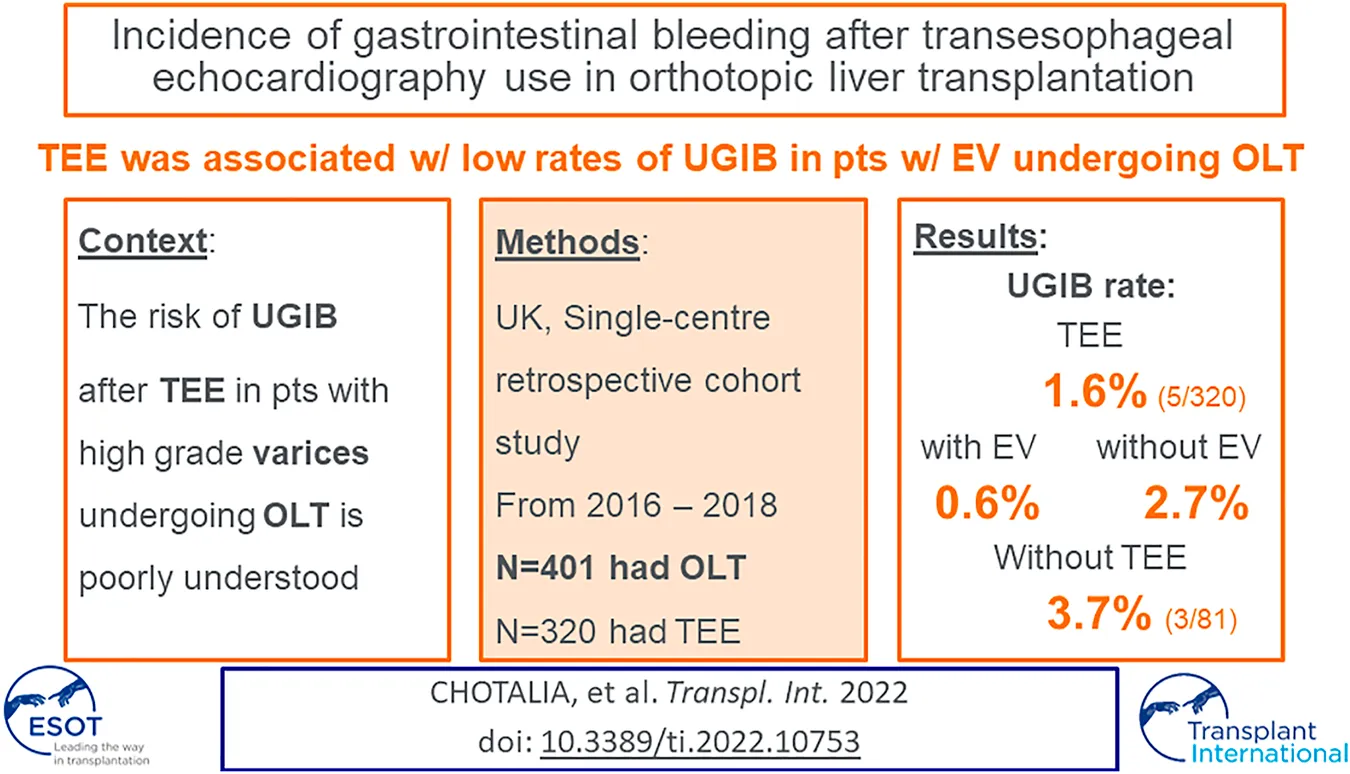 Chotalia M, Topiwala U, Iqbal A, Parekh D, Isaac JL, Perera MTPR and Arshad MA (2022) Incidence of Gastrointestinal Bleeding After Transesophageal Echocardiography Use in Orthotopic Liver Transplantation. Transpl Int 35:10753. doi: 10.3389/ti.2022.10753