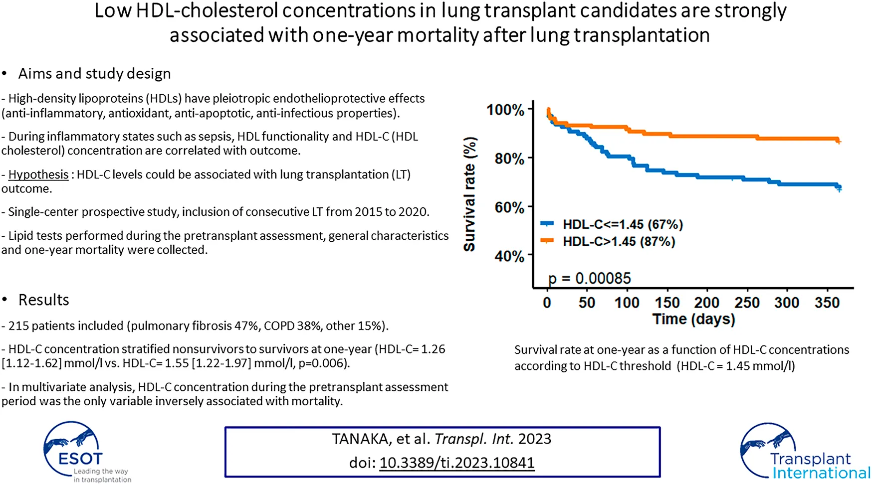 Tanaka S, Tymowski CD, Tran-Dinh A, Meilhac O, Lortat-Jacob B, Zappella N, Jean-Baptiste S, Robert T, Goletto T, Godet C, Castier Y, Mal H, Mordant P, Atchade E, Messika J, Montravers P and the Bichat Lung Transplant Group (2023) Low HDL-Cholesterol Concentrations in Lung Transplant Candidates are Strongly Associated With One-Year Mortality After Lung Transplantation. Transpl Int 36:10841. doi: 10.3389/ti.2023.10841