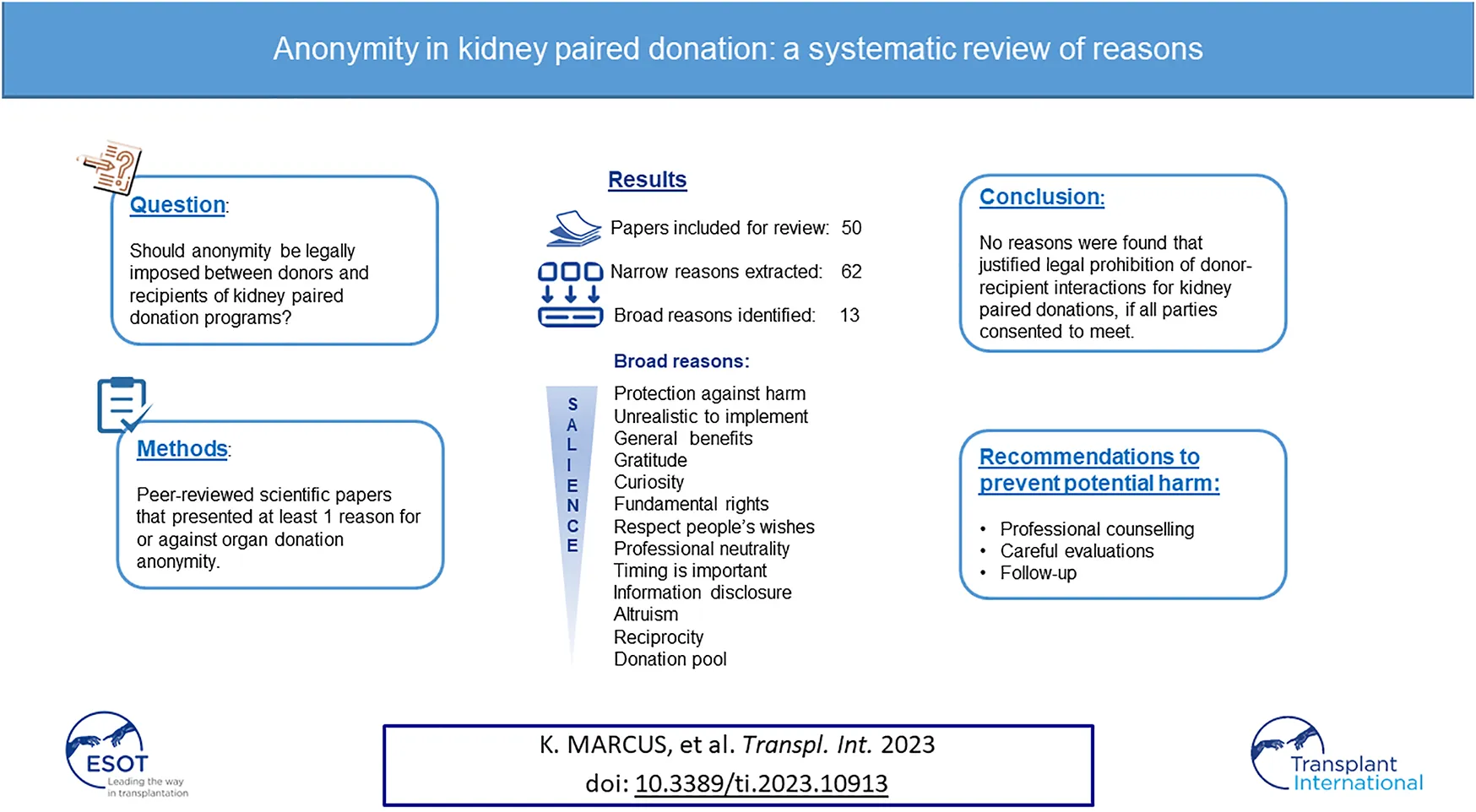 Marcus K, Berner D, Hadaya K and Hurst S (2023) Anonymity in Kidney Paired Donation: A Systematic Review of Reasons. Transpl Int 36:10913. doi: 10.3389/ti.2023.10913