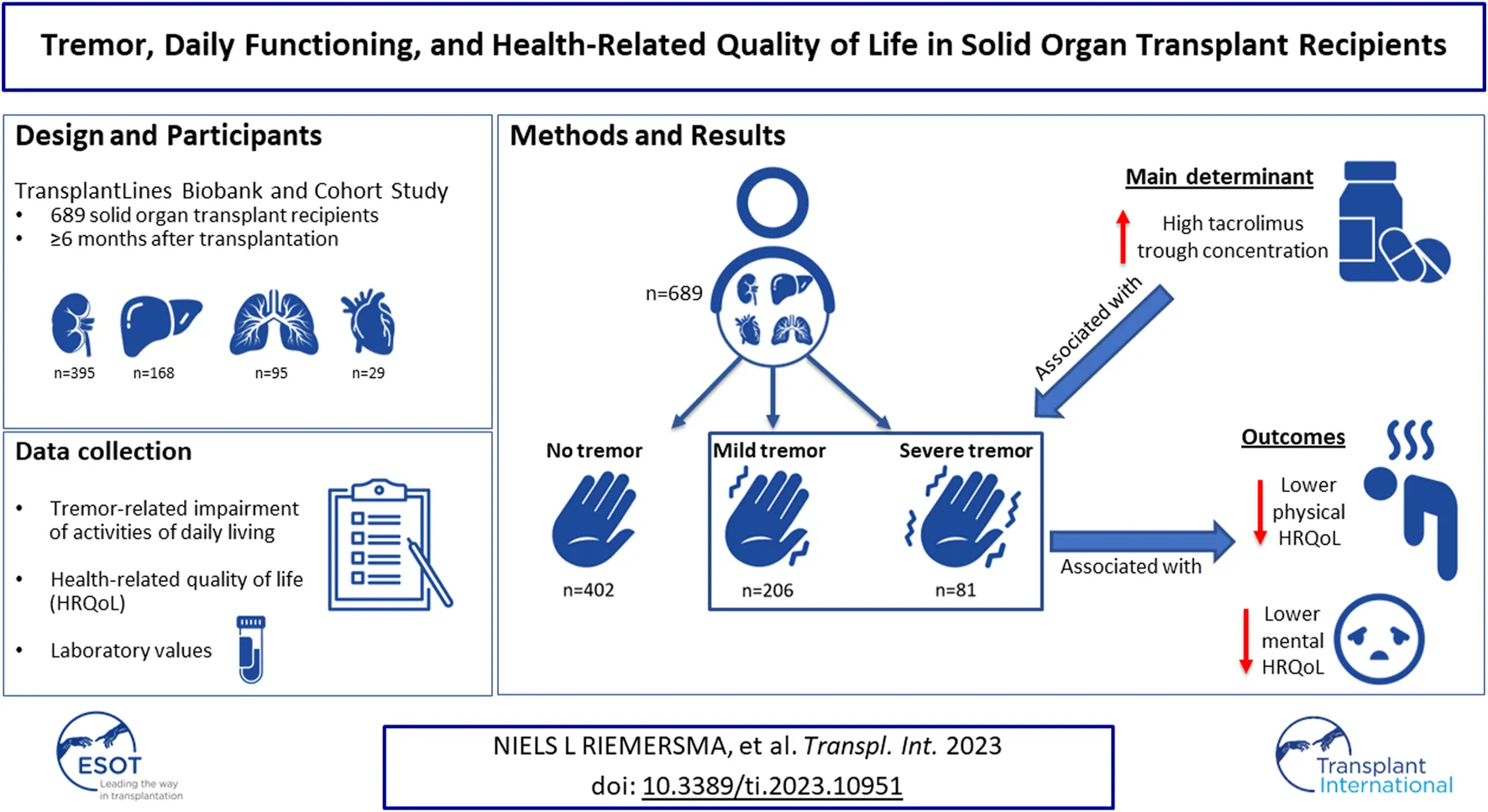 Riemersma NL, Kremer D, Knobbe TJ, Gan CT, Nolte S, Gomes-Neto AW, Blokzijl H, de Meijer VE, Damman K, Eisenga MF, Drost G, Elting JWJ, Touw DJ, Berger SP, Bakker SJL, van der Stouwe AMM and Transplantlines Investigators (2023) Tremor, Daily Functioning, and Health-Related Quality of Life in Solid Organ Transplant Recipients. Transpl Int 36:10951. doi: 10.3389/ti.2023.10951
