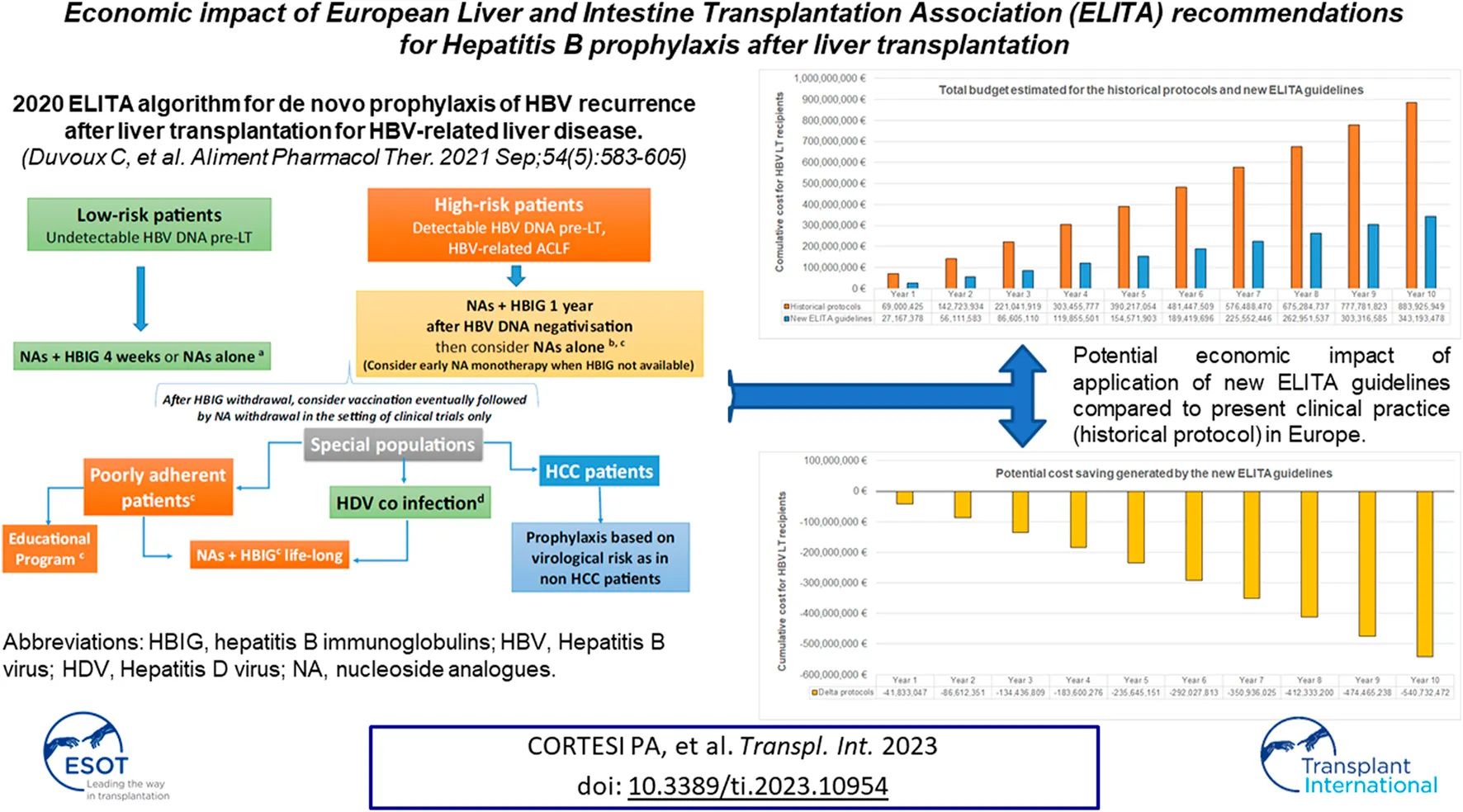 Cortesi PA, Viganò R, Conti S, Lenci I, Volpes R, Martini S, Angelico M, Fung J, Buti M, Coilly A, Durand F, Fondevila C, Lebray P, Nevens F, Polak WG, Rizzetto M, Zoulim F, Perricone G, Berenguer M, Mantovani LG, Duvoux C and Belli LS (2023) Economic Impact of European Liver and Intestine Transplantation Association (ELITA) Recommendations for Hepatitis B Prophylaxis After Liver Transplantation. Transpl Int 36:10954. doi: 10.3389/ti.2023.10954