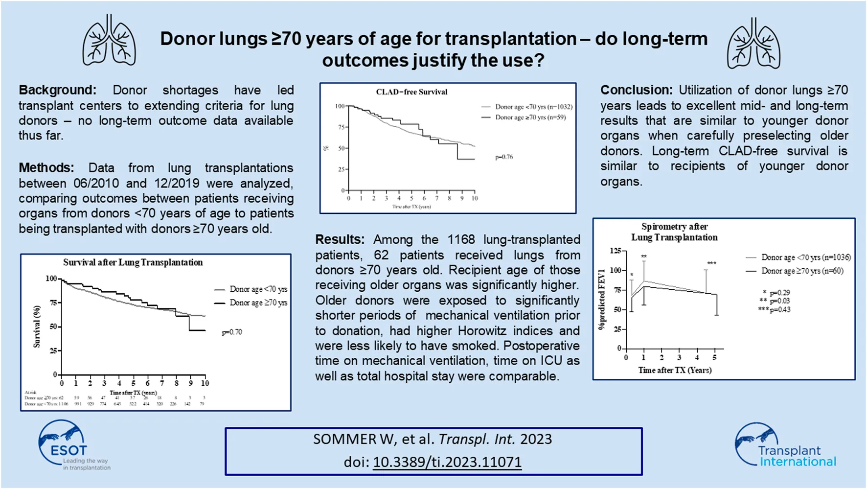 Sommer W Ius F Salman J Avsar M Tudorache I Kuhn C et al Survival and Spirometry Outcomes after Lung Transplantation from Donors Aged 70 Years and Older. J Heart Lung Transpl (2015) 34(10):1325–33. 10.1016/j.healun.2015.06.002