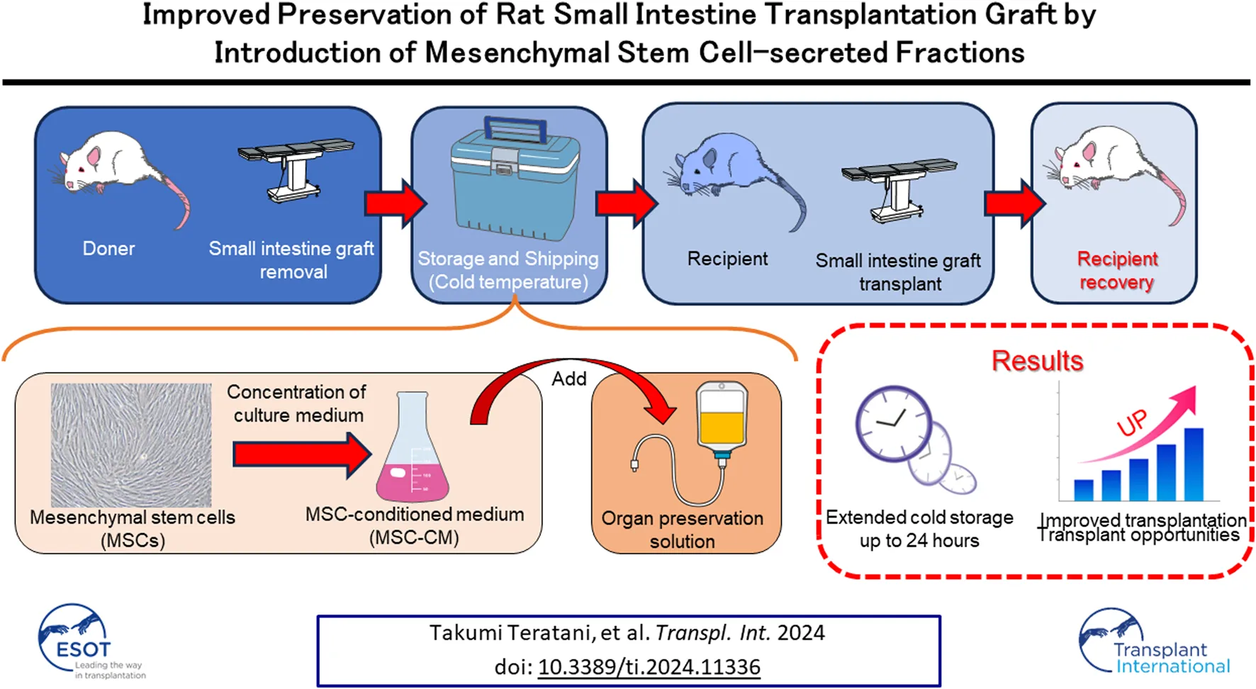 Teratani T, Fujimoto Y, Sakuma Y, Kasahara N, Maeda M, Miki A, Lefor AK, Sata N and Kitayama J (2024) Improved Preservation of Rat Small Intestine Transplantation Graft by Introduction of Mesenchymal Stem Cell-Secreted Fractions. Transpl Int 37:11336. doi: 10.3389/ti.2024.11336
