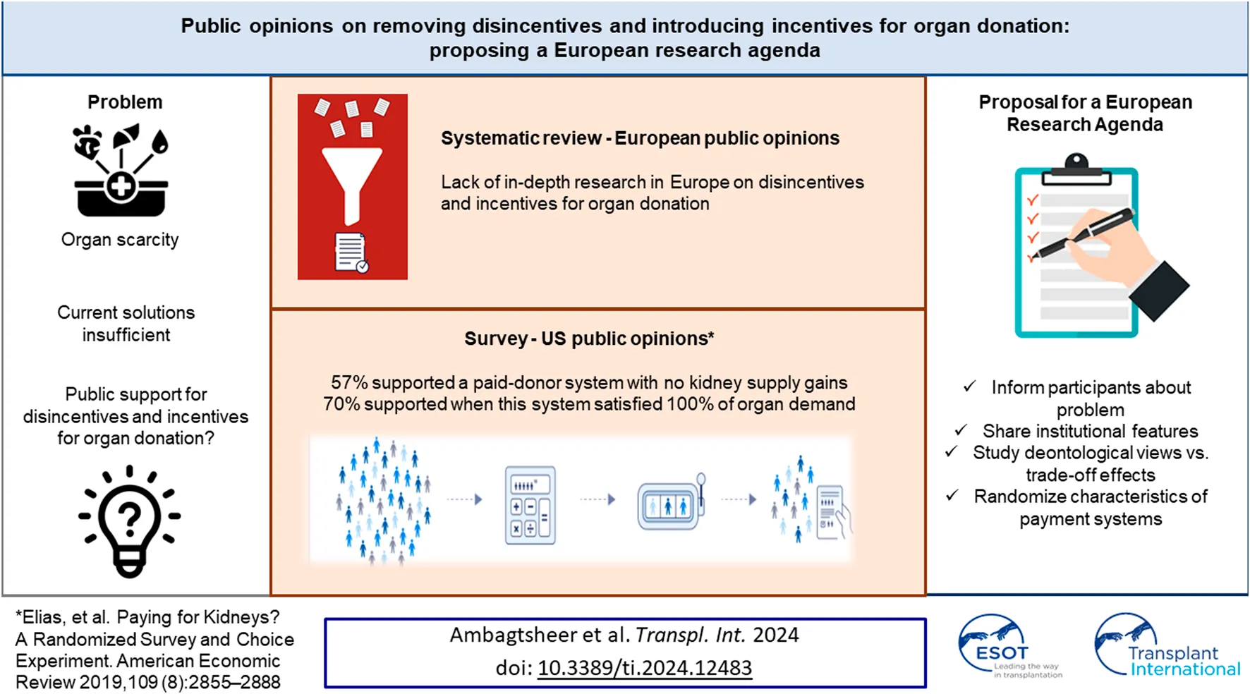 Ambagtsheer F, Bunnik E, Pengel LHM, Reinders ME, Elias JJ, Lacetera N and Macis M (2024) Public Opinions on Removing Disincentives and Introducing Incentives for Organ Donation: Proposing a European Research Agenda. Transpl Int 37:12483. doi: 10.3389/ti.2024.12483
