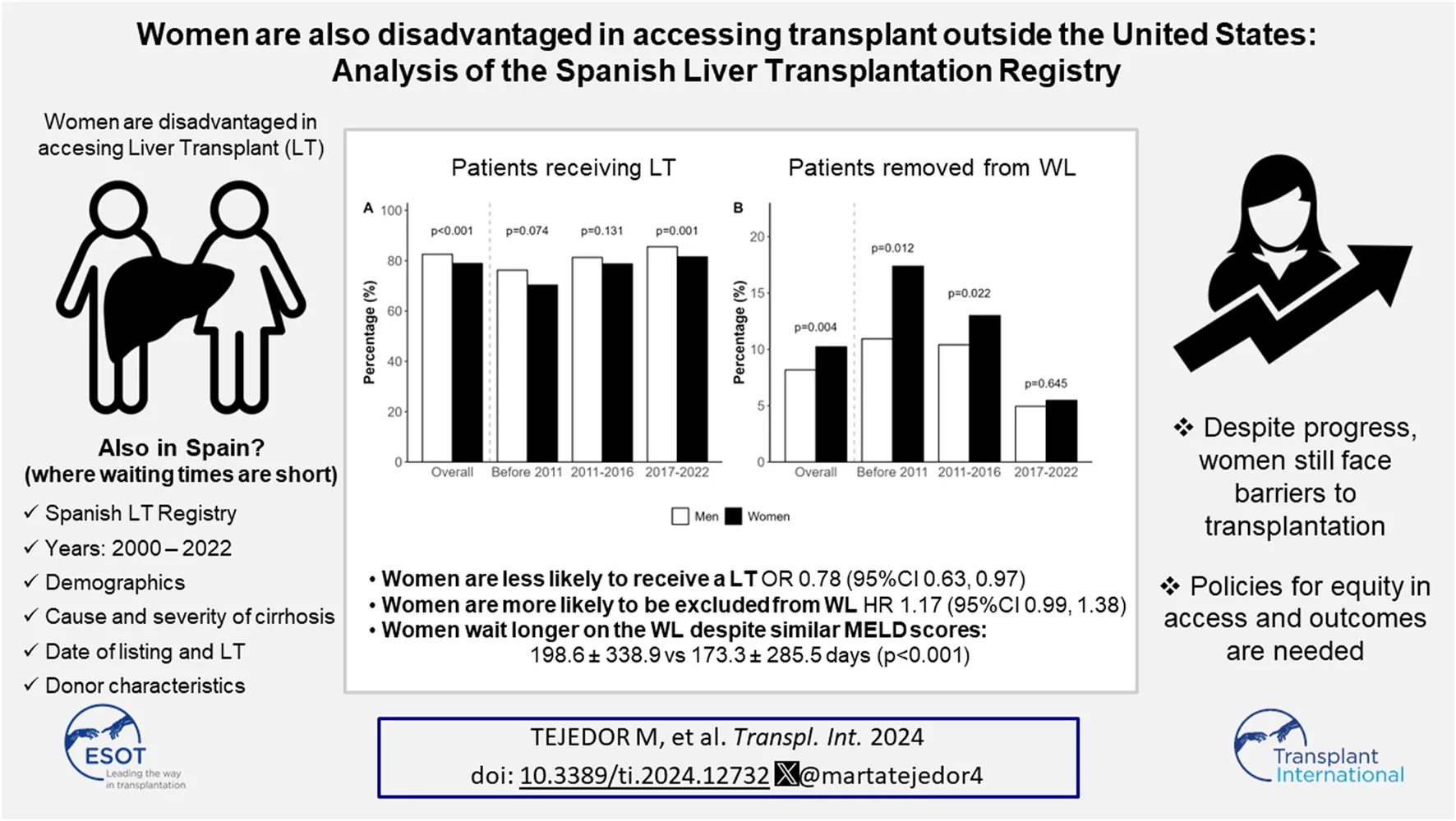 Tejedor M, Neria F, De La Rosa G, Almohalla Álvarez C, Padilla M, Boscà Robledo A, Fundora Suárez Y, Sánchez-Bueno F, Gómez-Bravo MA and Berenguer M (2024) Women Are Also Disadvantaged in Accessing Transplant Outside the United States: Analysis of the Spanish Liver Transplantation Registry. Transpl Int 37:12732. doi: 10.3389/ti.2024.12732