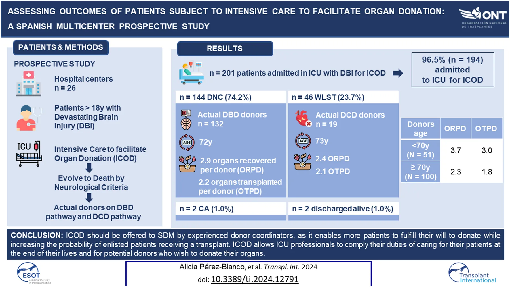 Pérez-Blanco A, Acevedo M, Padilla M, Gómez A, Zapata L, Barber M, Martínez A, Calleja V, Rivero MC, Fernández E, Velasco J, Flores EM, Quindós B, Rodríguez ST, Virgós B, Robles JC, Nebra AC, Moya J, Trenado J, García N, Vallejo A, Herrero E, García Á, Rodríguez ML, García F, Lara R, Lage L, Gil FJ, Guerrero FJ, Meilán Á, Del Prado N, Fernández C, Coll E and Domínguez-Gil B (2024) Assessing Outcomes of Patients Subject to Intensive Care to Facilitate Organ Donation: A Spanish Multicenter Prospective Study. Transpl Int 37:12791. doi: 10.3389/ti.2024.12791